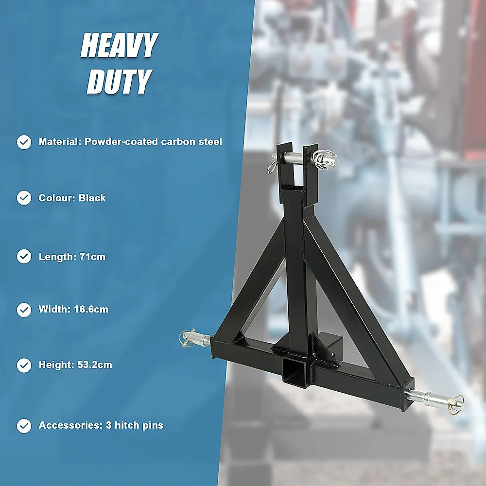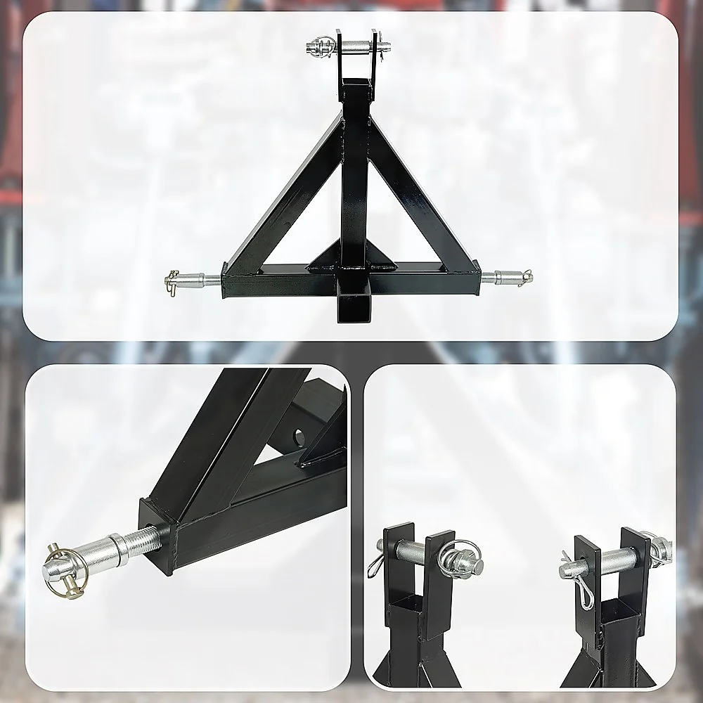 It's simple to install just tighten the attachment at the tractor lever's proper position. Its three-point suspension towbar allows you to manoeuvre easily when hauling trailers and other heavy machinery, while its three-point quick hitch works with all of the Category 1 tractors on the market. It's ready to go right out of the box it even comes with both the top and bottom pins for easy installation from the day you take delivery. Get a hitch that works as hard as you do. Order one of these tough three-point hitches today.