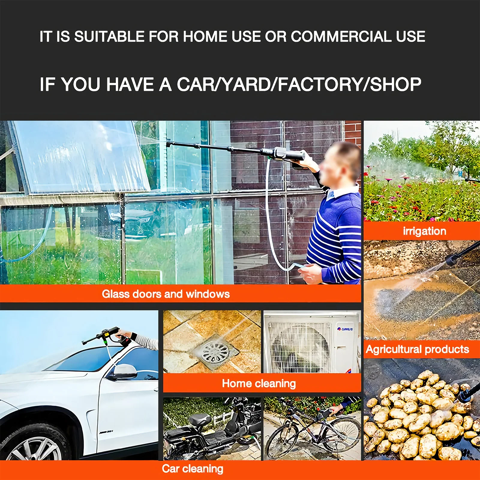 3. Cleaning and maintenance of various motor vehicles, engineering vehicles, engineering machinery and agricultural machinery supporting products. It is the most ideal cleaning tool for individuals and small vehicle maintenance units to clean cars and motorcycles.