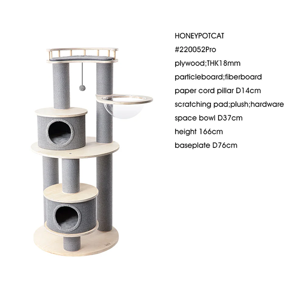 HONEYPOTCAT Majestic Reinforced Multi-Level Cat Tree blends modern and vintage design elements, featuring quality coatings from Huarun that meet the new national standard E0 formaldehyde emission ≤ 0.5mg/L. Its oversized base provides stable support, ensuring even large cats can play safely. The crescent-shaped semi-enclosed platform is both spacious and elegant, offering a comfortable resting area for your feline friends. The structure is not only stable and resistant to deformation but also odor-free, doesnt attract cat hair, and is pest-resistant, creating a safe and hygienic environment for cats to fully enjoy their lives.