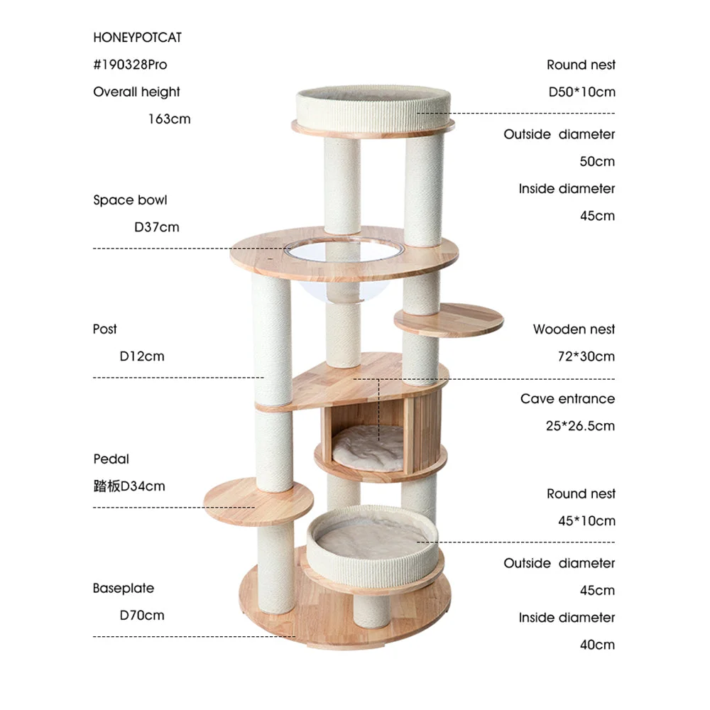 HONEYPOTCAT MZ Varnished Solid Wood Cat Tower With Capsule stands 163cm tall, offering a stylish and durable space for your cat to climb, scratch, and rest. Made from high-quality varnished solid wood, this tower combines strength and elegance, with a smooth finish thats easy to clean and maintain. The unique capsule-shaped resting area provides a cozy hideaway for your cat to relax, while multiple levels and scratching posts offer plenty of opportunities for exercise and play. Perfect for multi-cat households, this cat tower adds both functionality and beauty to any home.