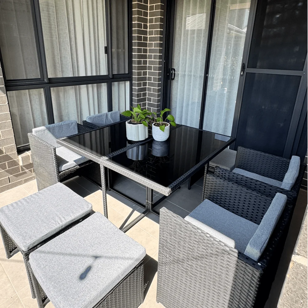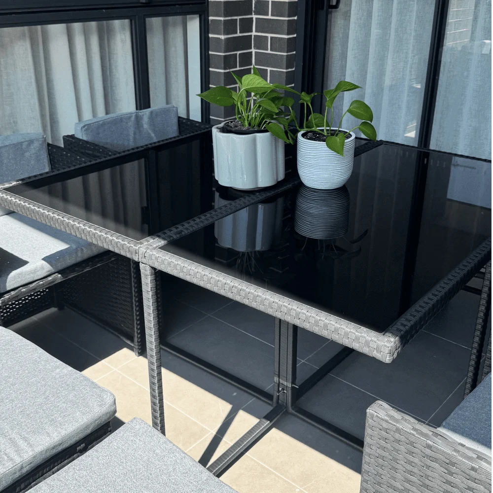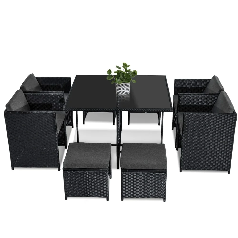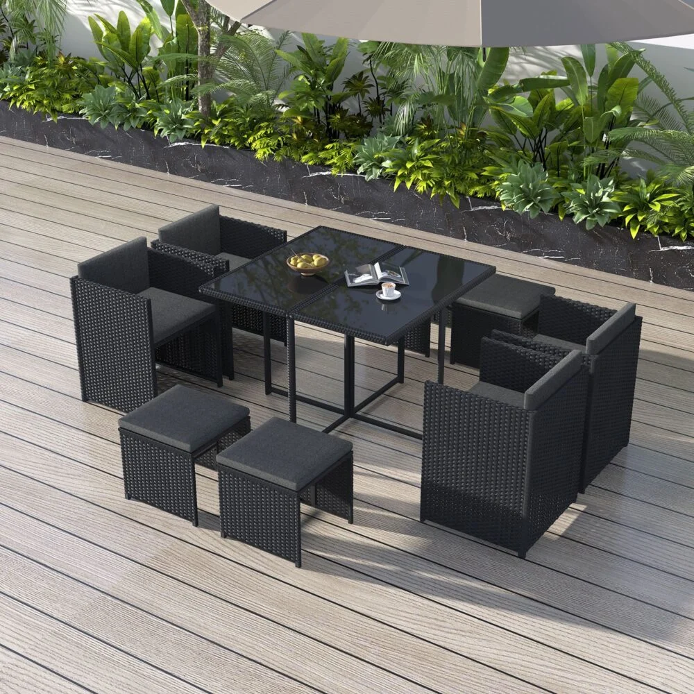 This rattan garden furniture oozes style while offering a beautiful simplicity. The nine-piece dining set can become the focal point of your patio area or garden, suiting a broad variety of backyard arrangements and garden landscapes. Benefit from the contemporary coolness of rattan, as well as its durability and lightweight. Transform your outdoor living space with this superb modern minimalist furniture collection.