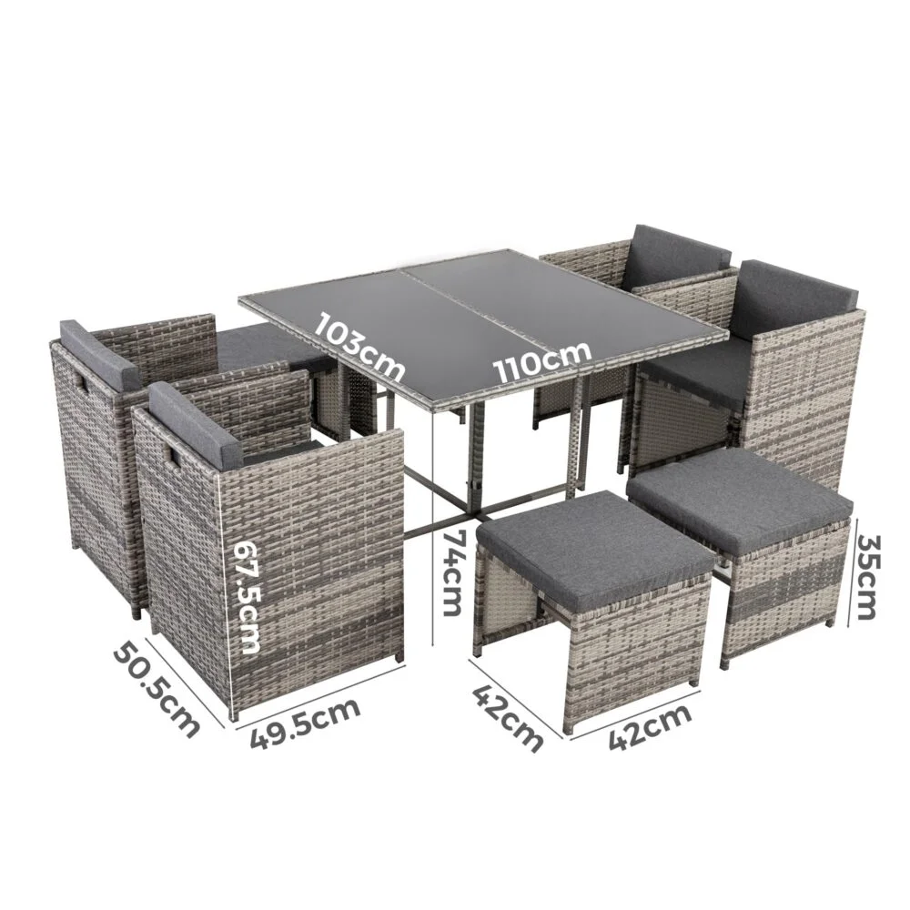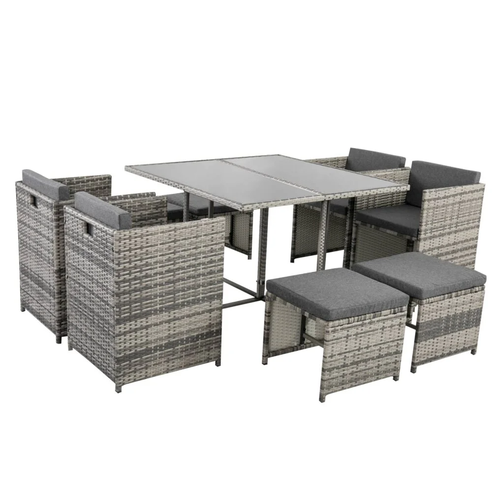 Our stylish rattan garden furniture set will become the focal point of your garden or patio!The design of 9 pieces patio dining sets will go well with any garden or backyard arrangement and landscaping. Fashionable rattan and modern design complements any space and the durable construction will make this piece a favorite of yours for summers to come, creating a beautiful and luxurious outdoor living space for you and your guests