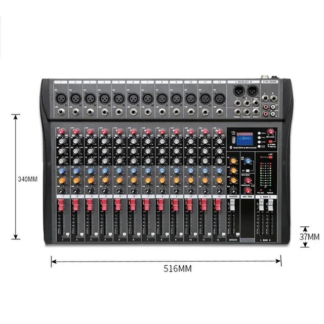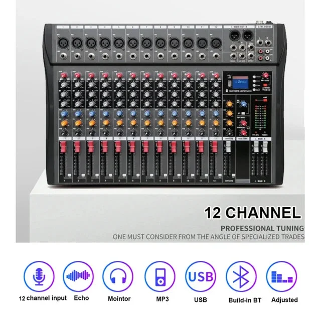 Powerful 12-Channel Mixer for DJs, Live Performances, and Outdoor Events The Hridz CT-120S is a robust 12-channel audio mixer designed for high-performance sound control in various settings, including outdoor events, live shows, DJ performances, and studio setups. Equipped with 48V phantom power, this mixer supports condenser microphones, ensuring clear and dynamic sound quality.