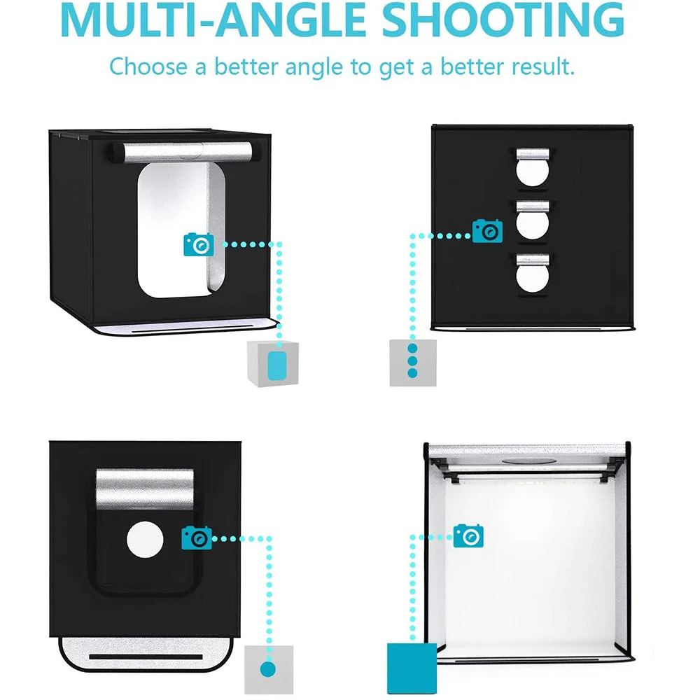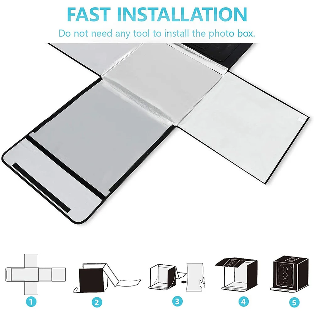 3. Easy to assemble (use it after three seconds of assembly), you can unfold this LED lightbox studio and place it on any surface to get very good backdrop for