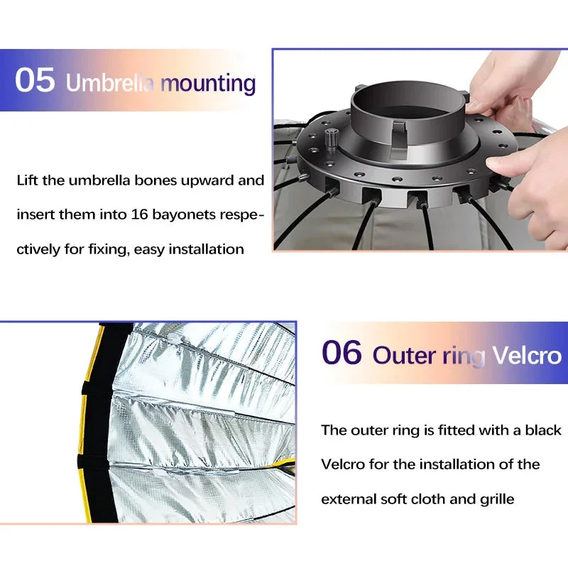 2. Universal Compatibility: Featuring a Bowens-mount system, this softbox seamlessly integrates with a wide array of Bowens-mount flashes and video lights, offering versatility and flexibility in your lighting setups.