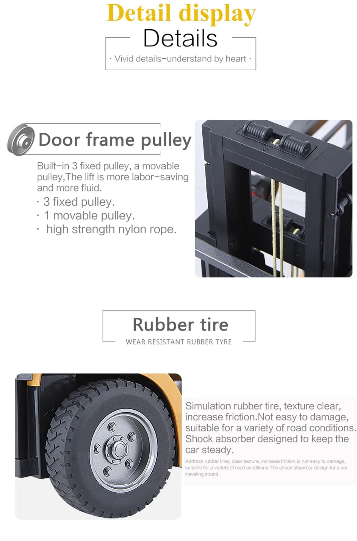 The HuiNa 8-Channel 2.4G ForkLift is a scale model of a real forklift that works just like the real thing. The frame is made of hard metal alloy for durability, while the powerful motor allows for uphill climbing.