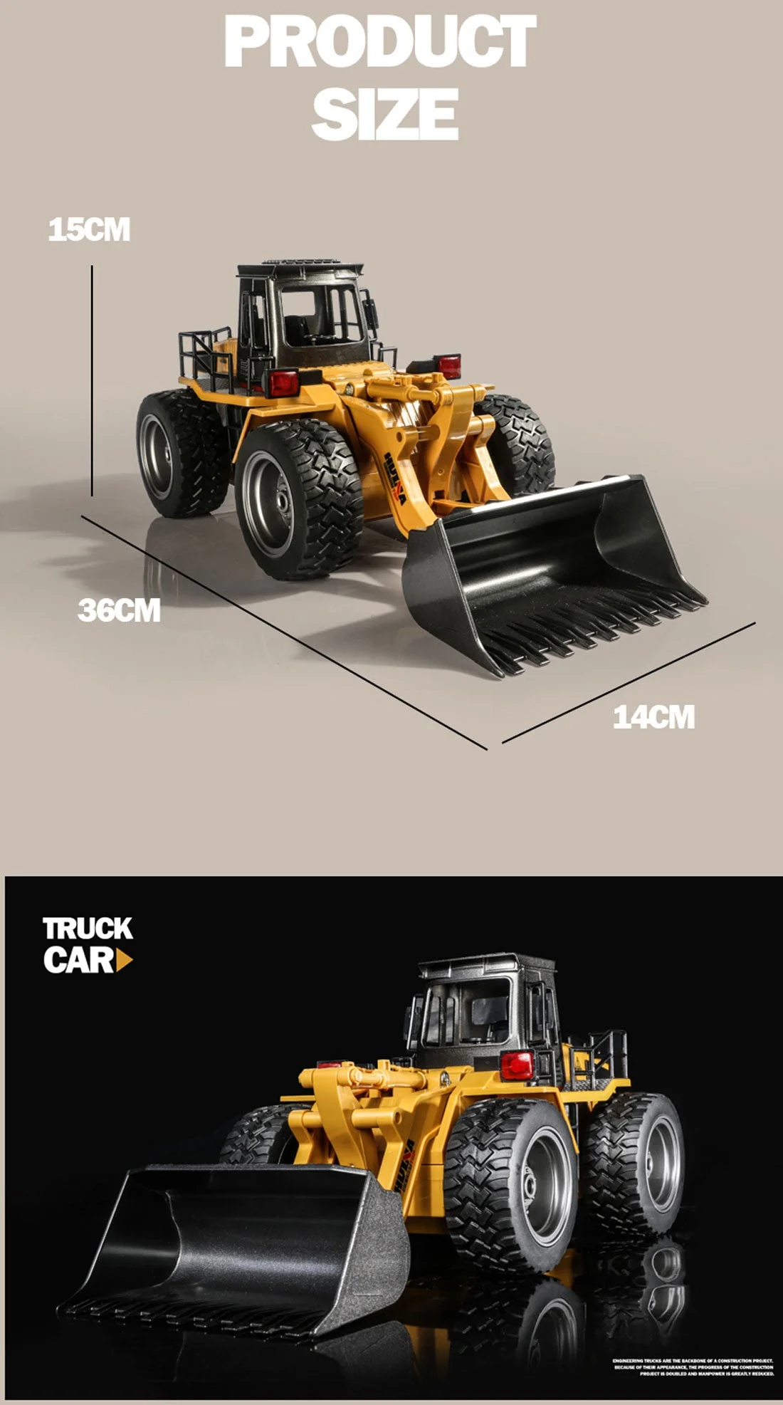Channel 2.4G bulldozer is a scale RC model of a real bulldozer that works just like the real thing. The frame is made of hard metal reinforced alloy for durability, while the powerful 4WD double motors allows for traversing even the toughest terrain. The wheels are made of hard metal for durability with slip-resistent rubber tyres