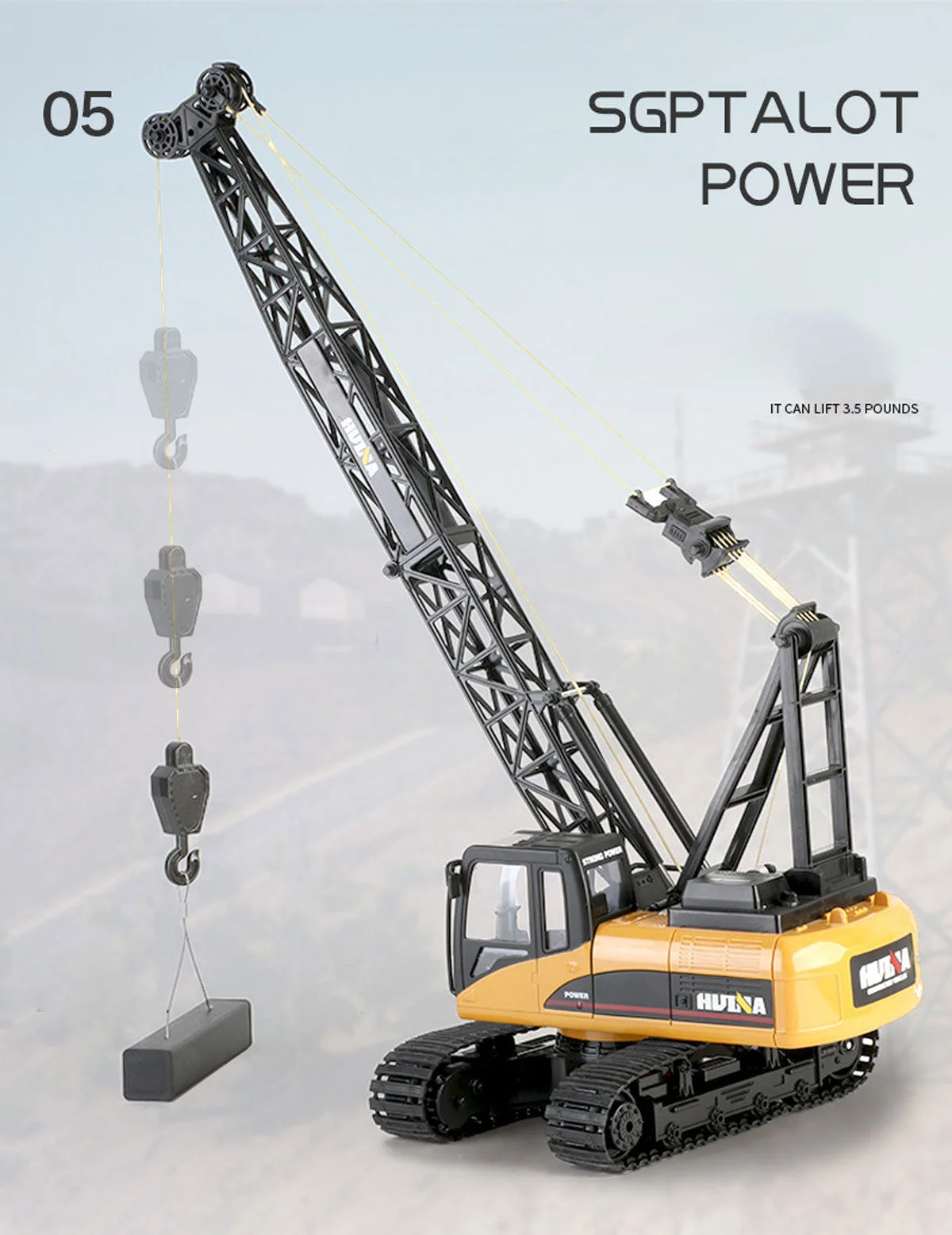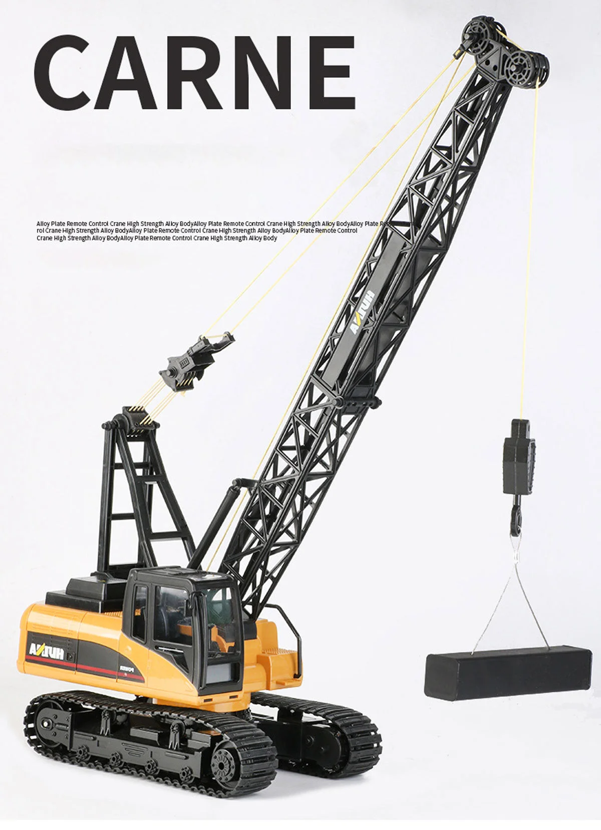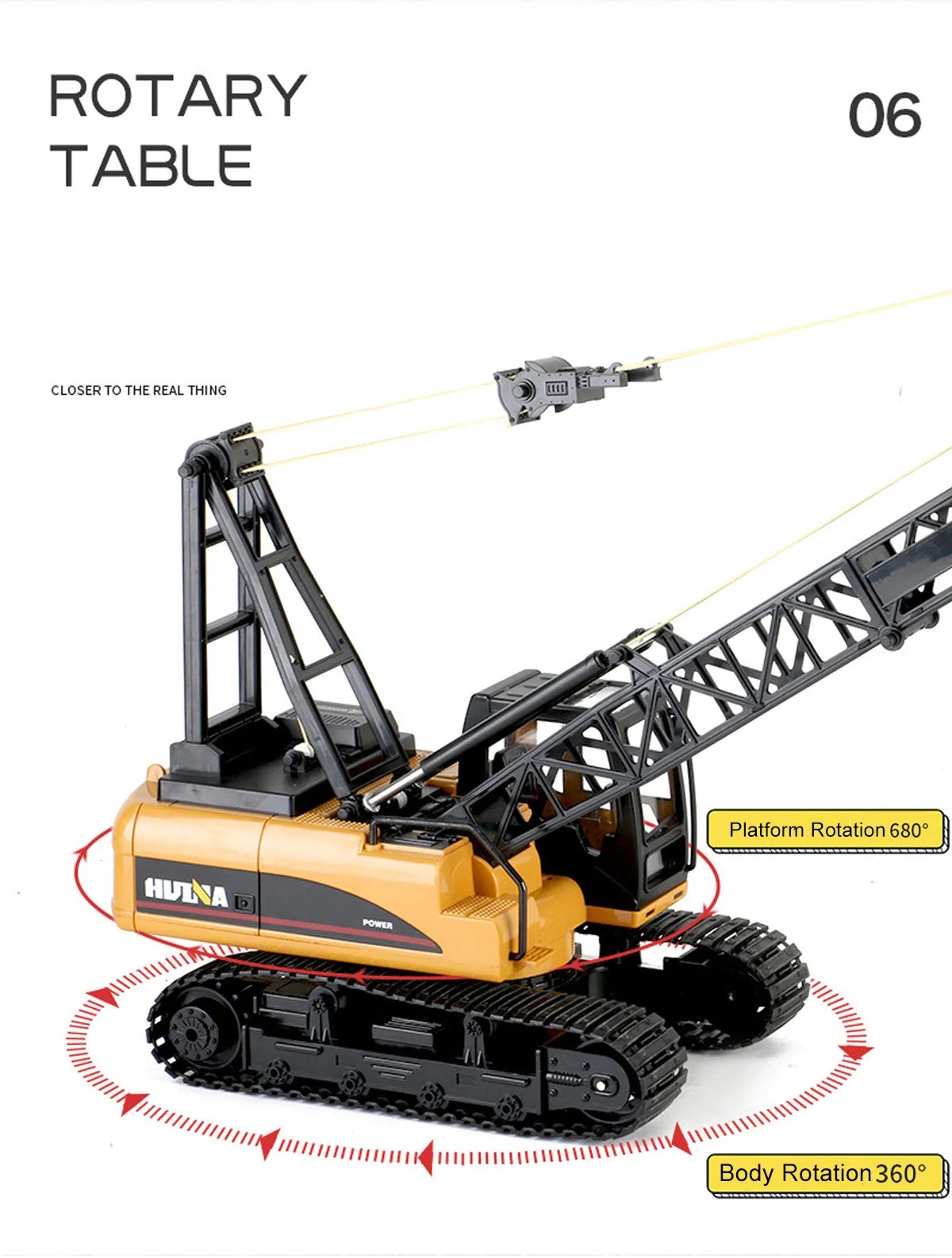 HUINA 1/14 SCALE RC CRAWLER CRANE 2.4G 15CH W/GRABThe HuiNa 15-Channel 2.4G Excavator is a 1/14 scale model of a real excavator that works just like the real thing. The bucket, cab and wheel hubs are all made of hard metal alloy for durability, while the rubber tread resist slip and wear, making it possible to climb effortlessly.