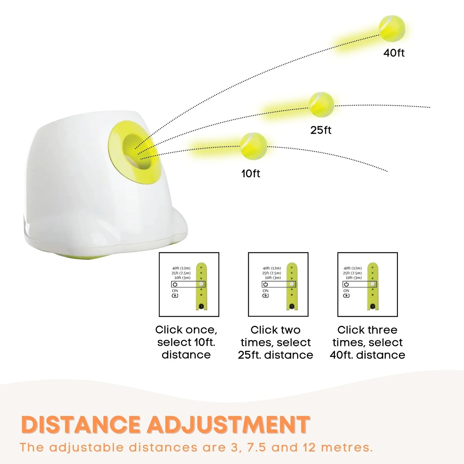 - Adjustable Distance Settings - make it throw 10ft (3m), 25ft (7.5m) or 40ft (12m). Great training tool for both older dogs and as a way to tire out energetic puppies.