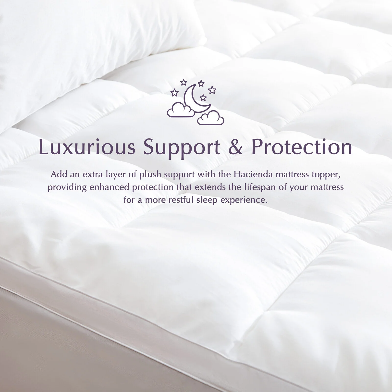 Designed to regulate temperature, the bamboo blend naturally wicks away moisture and provides a cooling effect, keeping you comfortable all night long. Whether you're looking to refresh an older mattress or add an extra layer of plush support, the Hacienda topper delivers luxurious comfort and protection for a restful sleep experience.