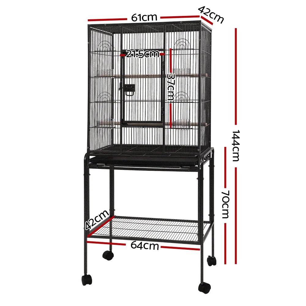 This beautiful and spacious 144cm bird cage is definitely the most comfortable roost for your little one. Made of high quality anti rust frame and wire, you can be assured of its durabliity. This cage provides sufficient space for your pet, suitable for small to medium size birds and parrots. With lockable casters, it provides maximum mobility and stability. Move the cage indoors, outdoors or wherever you like! The bird cage is fitted with slide out trays for easy cleaning. Equipped with every bird's favourite entertainments, your little one will surely love it!