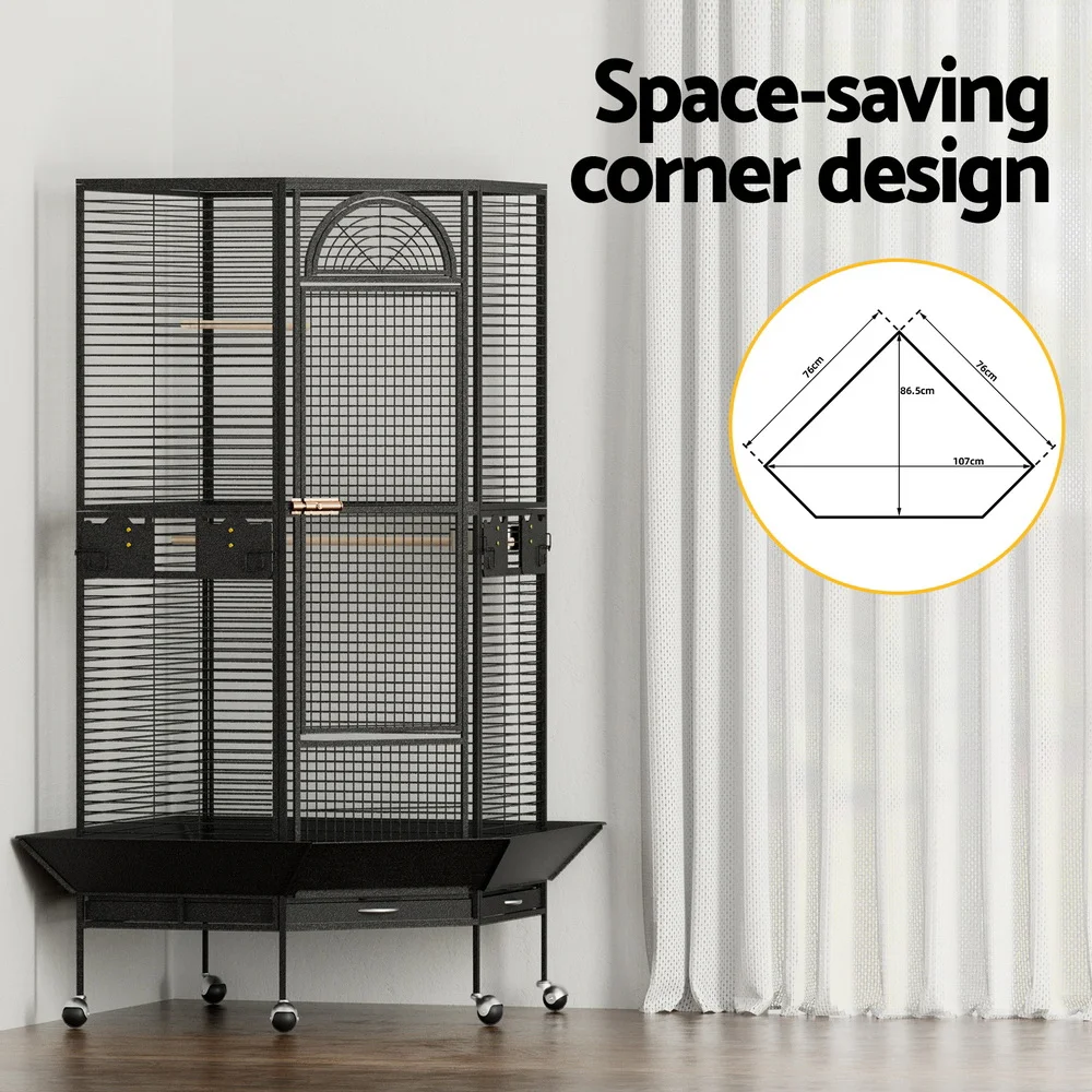 Caring for your flock is easy with an i.Pet Bird Cage. With our space-saving corner design, you can keep your birds in good company while maintaining free movement in your home. Made from durable wrought iron with a protective coating, this cage is built to last. It features a large entrance and four swinging food access windows, providing easy access for both you and your bird. Two slide-out removable trays and two removable grates make cleaning a breeze. With two wooden perches and four feeder cups, your birds will have plenty of space to eat and play. The stand is supported by four smooth castor wheels, making it easy to move around. Suitable for small to medium birds, you'll love the convenience of the i.Pet Corner Bird Cage.