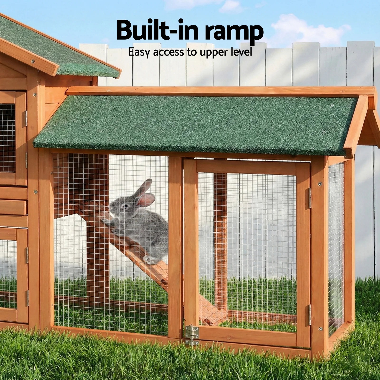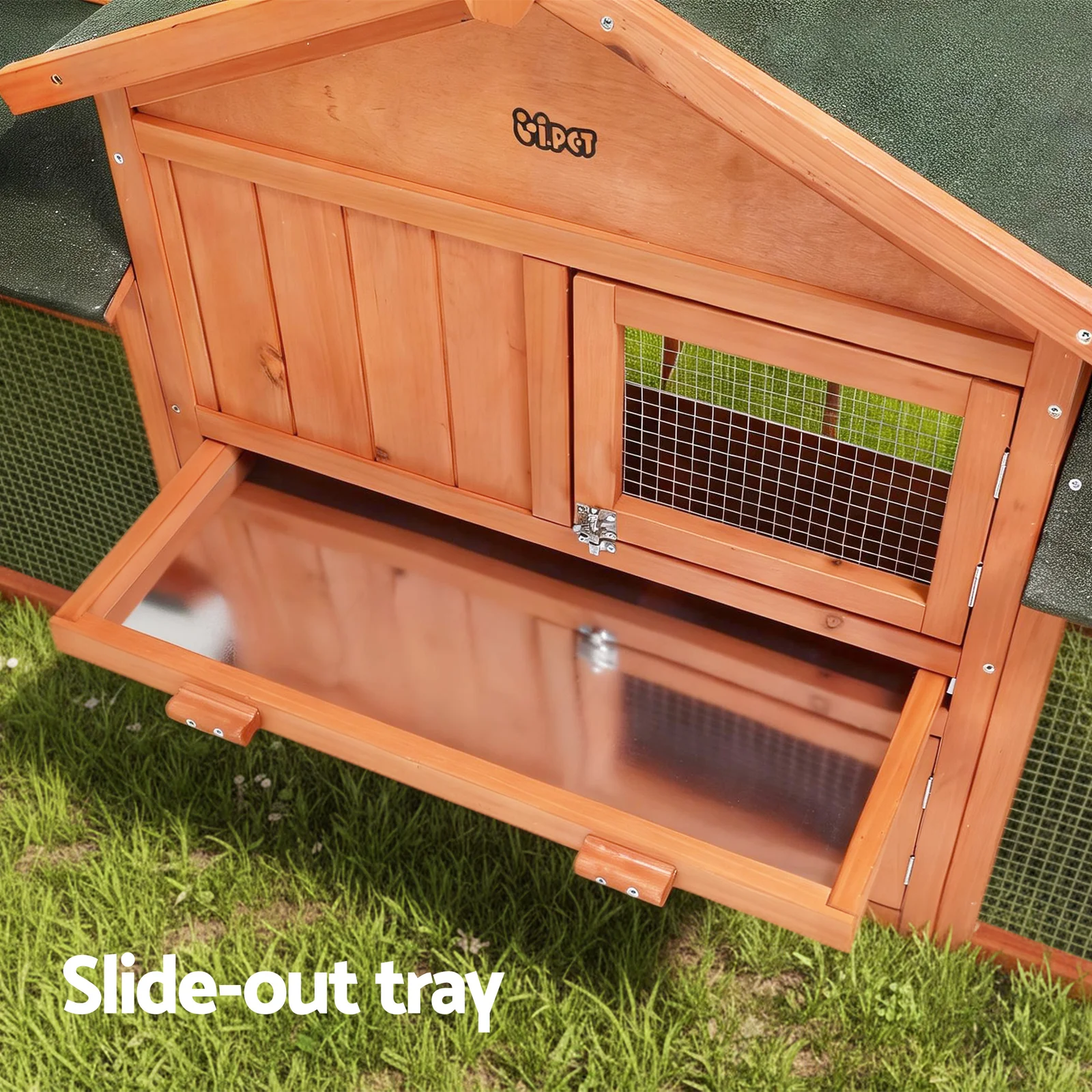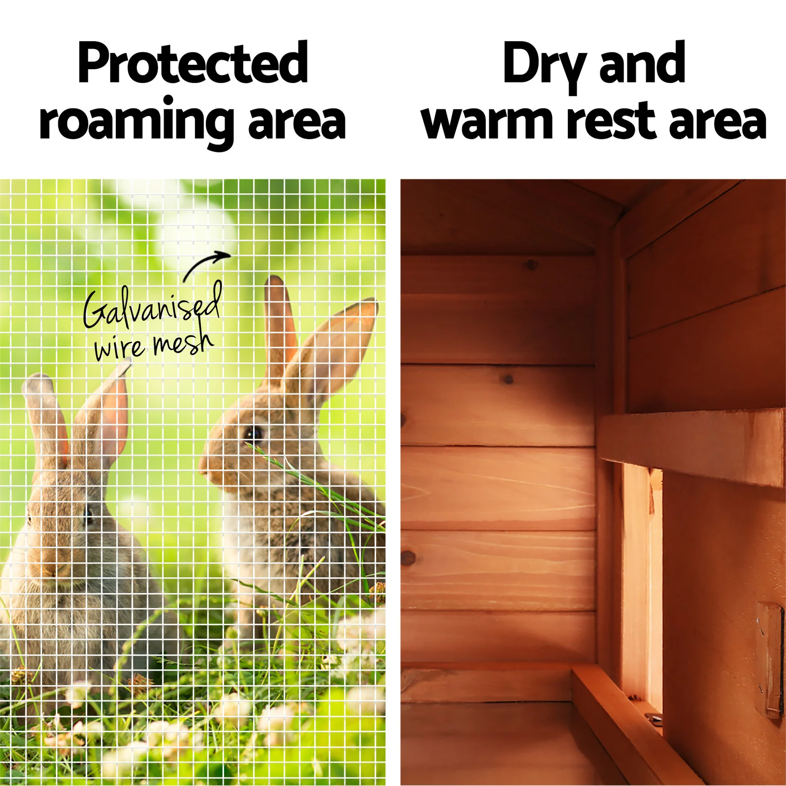 Featuring a fir wood construction, our i.Pet Pet Hutch is the perfect home for your little pets. It incorporates two living areas – one cosy bedroom on the upper level and a spacious play area on the ground level. The three doors provide easy access and cleaning to the living areas and are equipped with strong and firm security locks. The hutch is waterproof, anti-termite and is made of TUV approved eco-friendly materials. Moreover, it features a green asphalt roof to insulate your pets from the heat during summer and against the rain in winter, providing maximum comfort to your pets all year round. The hutch does not only provide a five-star living environment, the architectural design also makes cleaning and feeding easier for you. So seek no further than our pet hutch when looking for the ideal home for your pets!