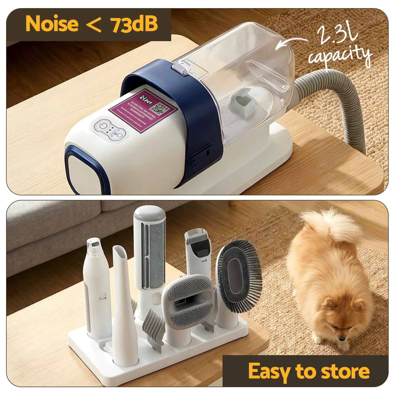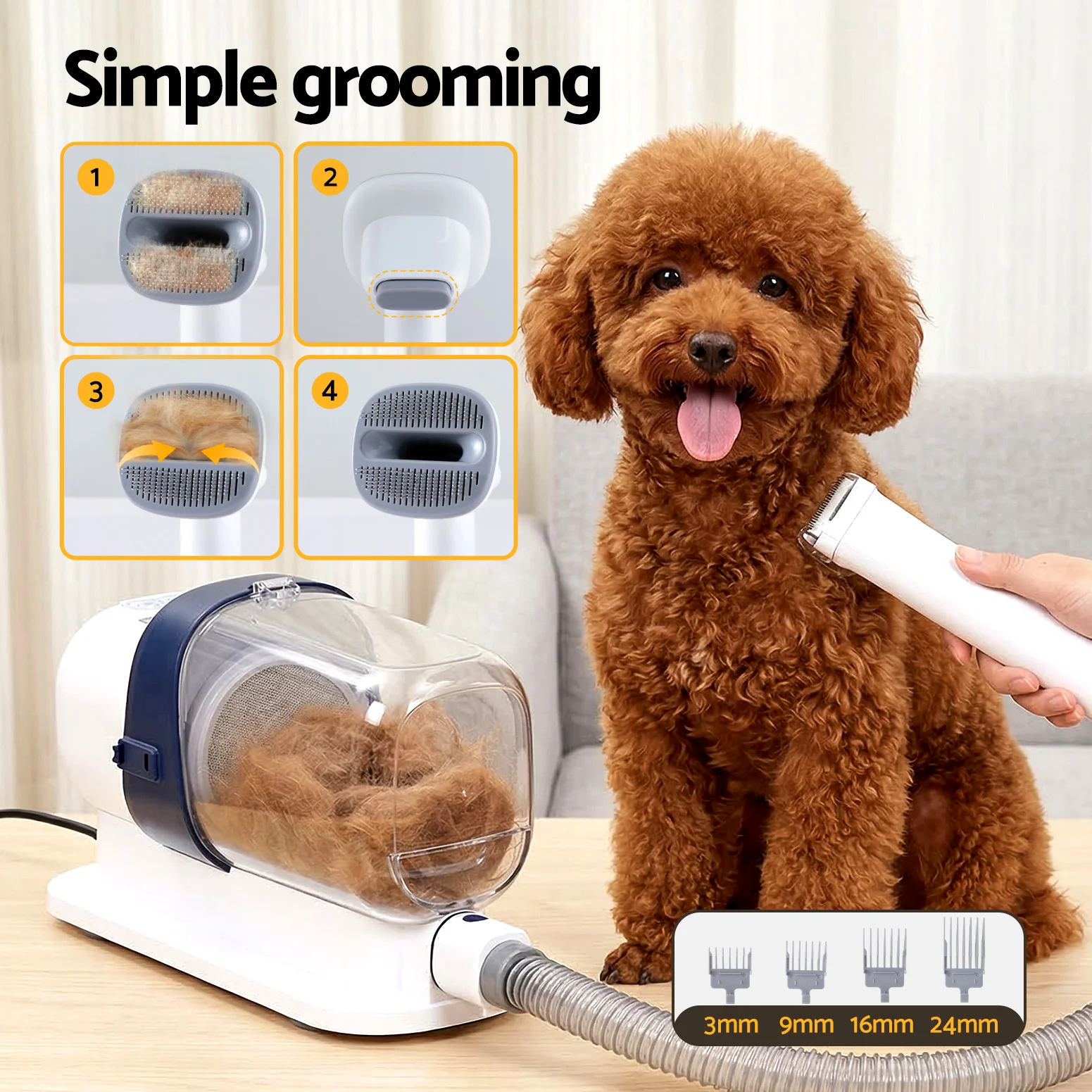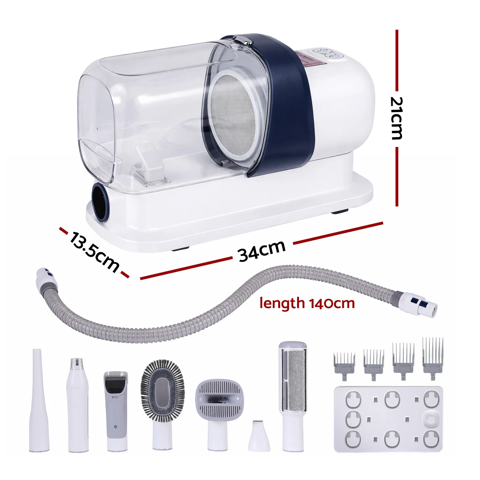 The iPet Hair Dryer doesn't just keep your pet looking great—it also helps maintain a cleaner home. The built-in vacuum swiftly removes loose hair as you groom, and the bonus storage tray keeps your tools organised and ready for use. Treat your pet to a stress-free grooming session with this all-in-one solution.