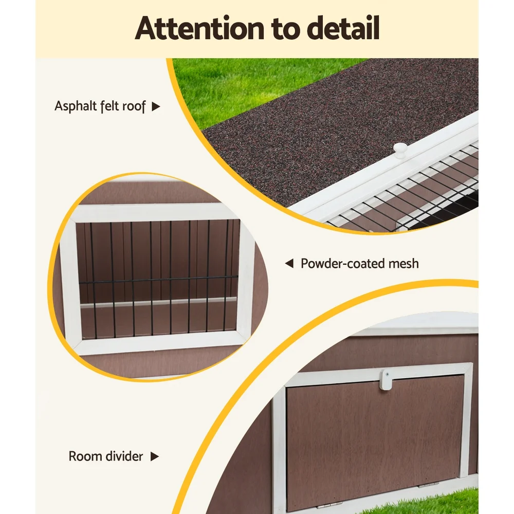 Create more living space for your rabbits with our i.Pet rabbit hutch. Made of high quality fir wood, the hutch has a large open-top access as well as unrestricted accessibility within the hutch. The power coated mesh is durable and also offers ample ventilation for your creatures. There are also adequate secured metal support rod to keep the hutch well stable.Moreover, it features asphalt roof to insulate your pets from the heat during summer and against the rain in winter.Bring the best comfort to your pet all year round. It's the five star home they deserve!