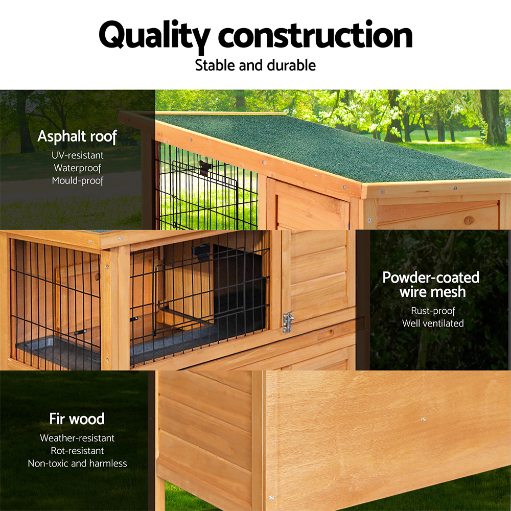 Featuring a high-quality and eco-friendly fir wood construction, our cosy i.Pet Pet Hutch is the perfect home for your little pets. It incorporates three level of living areas with foldable built-in ramps between levels, to allow your little furry friends to easily move up and down. You can even choose to close off the ramp access altogether to keep each level completely separated depending on your needs. The slide-out floors, lift-up roof and six easy-to-access front doors equipped with strong and firm security locks, all allow for convenient handling, cleaning and ventilating. The hutch is waterproof, anti-termite and made of RoHS-approved eco-friendly materials. Moreover, it features a green asphalt roof to insulate your pets from the heat during summer and against the rain in winter, providing maximum comfort all year round. Our pet hutch not only provides a five-star living environment, the architectural design also makes cleaning and feeding easier for you! Features: High-quality fir wood construction Powder-coated wire Angled green asphalt roof 3-tier living areas 6 easy-to-access doors 2 foldable built-in ramps between floors 3 slide-out floor trays for easy cleaning Waterproof and anti-termite Contoured edges Strong and firm security locks Lift-up roof Made of RoHS-approved eco-friendly material Spacious, comfortable and safe for small animals Specifications: Materials: Fir wood, asphalt roof, steel mesh Overall dimensions: 91.5cm x 46cm x 116.5cm Please refer to gallery for further dimensions Package Contents: 1 x Pet Pet Hutch 1 x Assembly kit 1 x Assembly Guide