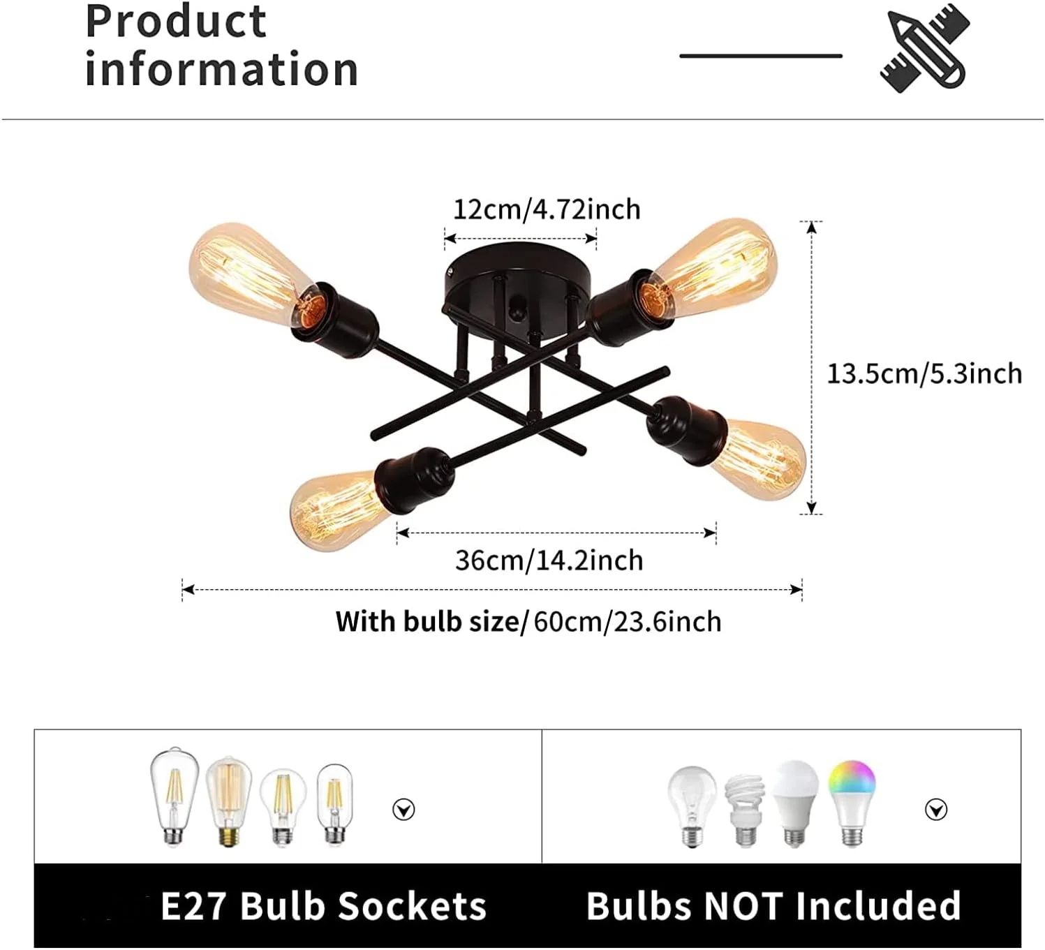 - This 4-light black sputnik light fixture adds a modern touch to any small room or lower ceiling. Its high quality metal construction and black painted finish will provide years of reliable use. The fixture measures approximately 36 cm in diameter and 13.5 cm in height, while the ceiling canopy measures 12 cm. Requires 4 pieces E27 bulbs (not included). Make sure to check the size before ordering.