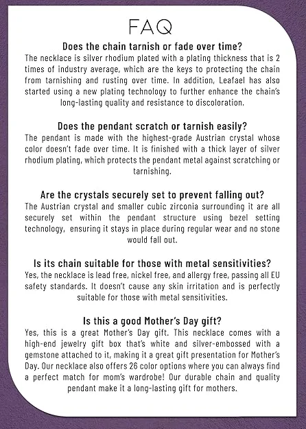 2.Exquisite Craftsmanship: Our heart necklace boasts a captivating 0.75 x 0.88-inch birthstone crystal with rhodium plating and an 18-inch chain. The meticulous design features a secure lobster claw clasp, making it a perfect jewelry gift for women.