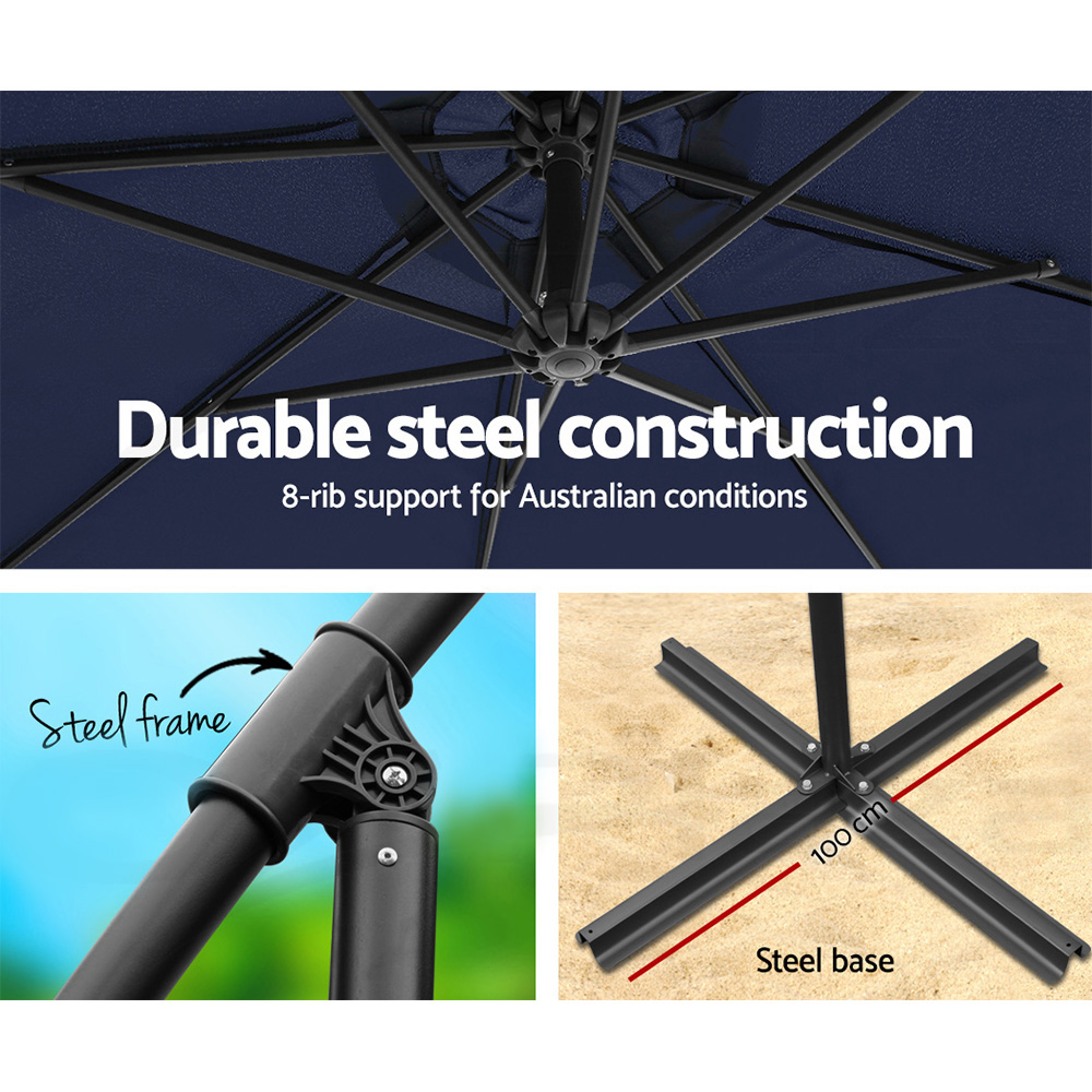 Soak up the sun, while staying cool under our Instahut side post umbrella. Its robust steel frame supports an octagonal UV50+ canopy, ideal for the peak of summer. Made of water-resistant and wear-resistant polyester, it stands up to all sunny adventures. Sunshine and shade, harmoniously blended for your summer escapades. FeaturesSide post design with octagonal canopyUV50+, Water-resistant, wear-resistant polyester canopyDurable steel construction with 8 steel rib supportEasy open/ close mechanism with user-friendly cracking system Specifications:UV Protection: UPF 50+Canopy colour: NavyCanopy material: 180gsm Polyester fabricFrame colour: BlackFrame material: Coated steelCanopy diameter: 3mOverall height: 2.8mClearance height: 2.3mPole diameter: 48mmAssembly required: YesNo. of package: 1 Package ContentInstahut Outdoor Umbrella x1User Manual x1 This product comes with 1 year warranty