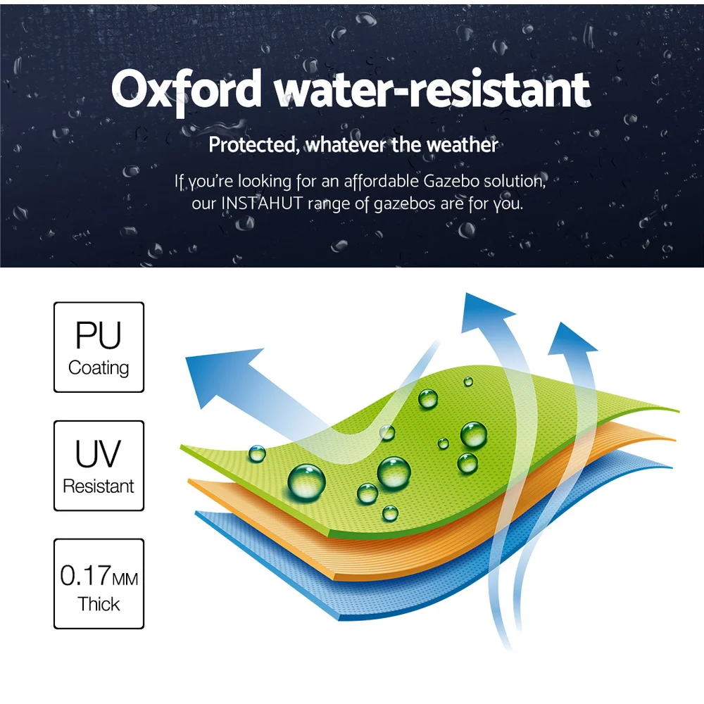 Featuring high density, long lasting PU coating oxford fabric with effective UV and water repellent treatments, this INSTAHUT 3X3 Pop Up Gazebo provides a lovely ground and canopy coverage of 300 x 300cm. It is perfect for all your upcoming outdoor activities, as a sunshade station as well as a shelter for unexpected rains.