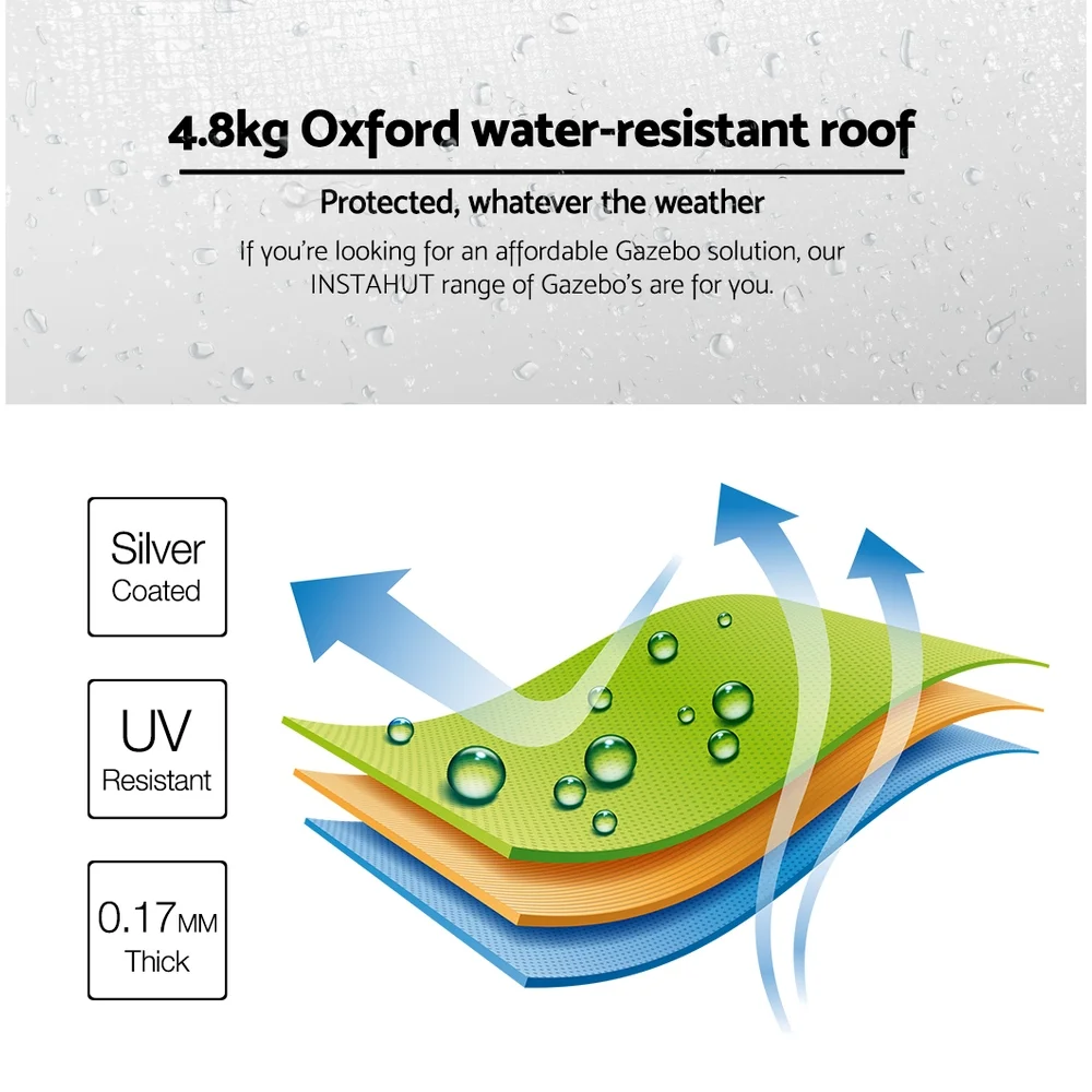 eaturing high density, long lasting PU coating oxford fabric with effective UV and water repellent treatments, this INSTAHUT 4.5x3 Pop Up Gazebo provides a lovely ground and canopy coverage of 450 x 300cm. It is perfect for all your upcoming outdoor activities, as a sunshade station as well as a shelter for unexpected rains.