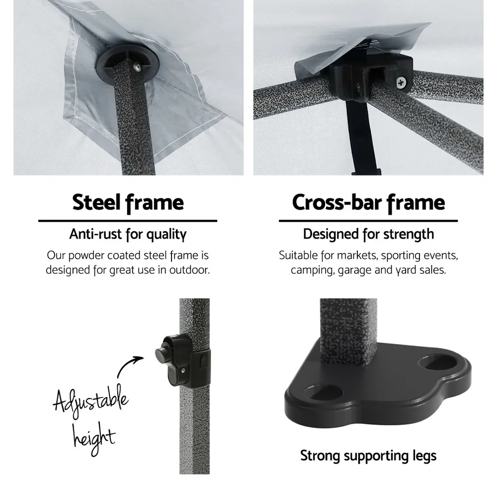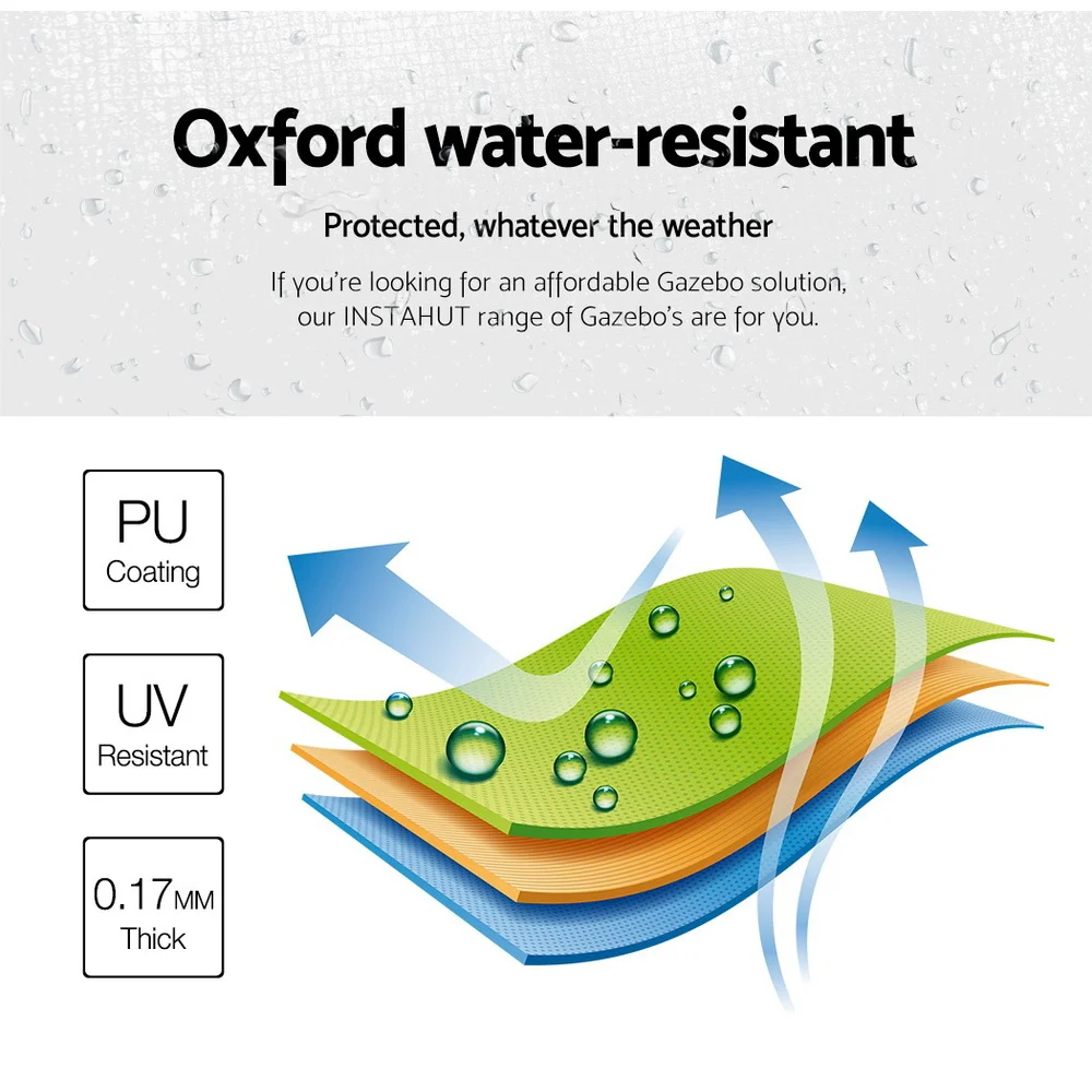 With a wide roof coverage of 300cm by 600cm, the exceptional 6kg cover is made of durable PU coating Oxford fabric that’s both UV and water resistant. No more worries about being too hot or too wet, you can get your event going with total peace of mind from the elements. Giving you ample dry cover from rain and adequate protection from UV radiation.