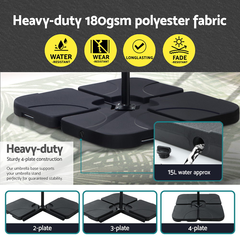 Introducing our Instahut Outdoor Umbrella with UV50+ polyester canopy, resistant to water and wear, and built with a sturdy steel frame for durability. This umbrella also features solar-powered LED lights with 32 LEDs on the ribs, alongside an easy open/close system and user-friendly crank for effortless operation.FeaturesSolar-powered LED lights32 LED lights on ribsSide post design with octagonal canopyUV50+ polyester canopy, water and wear-resistantStrong steel frame with 8 ribsAdjustable tilt mechanism for precise shading controlEasy open/close with a user-friendly crank systemModular 4-plate base for versatile outdoor setupsSturdy base supports up to 64kg with water (16kg per plate)Handles on base plates for easy relocationSpecifications:UV Protection: UPF 50+Canopy colour: CharcoalCanopy material: 180gsm Polyester fabricFrame colour: BlackFrame material: Coated steelCanopy diameter: 3mOverall height: 2.8mClearance height: 2.3mPole diameter: Φ48mmBase dimensions: Base length: 100cm, Base height: 7.5cmBase weight when filled sand: 72kgAssembly required: YesNo. of package: 2Package ContentInstahut Outdoor Umbrella x 1Instahut Umbrella Base x 1User Manual x 1This product comes with 1 year warranty