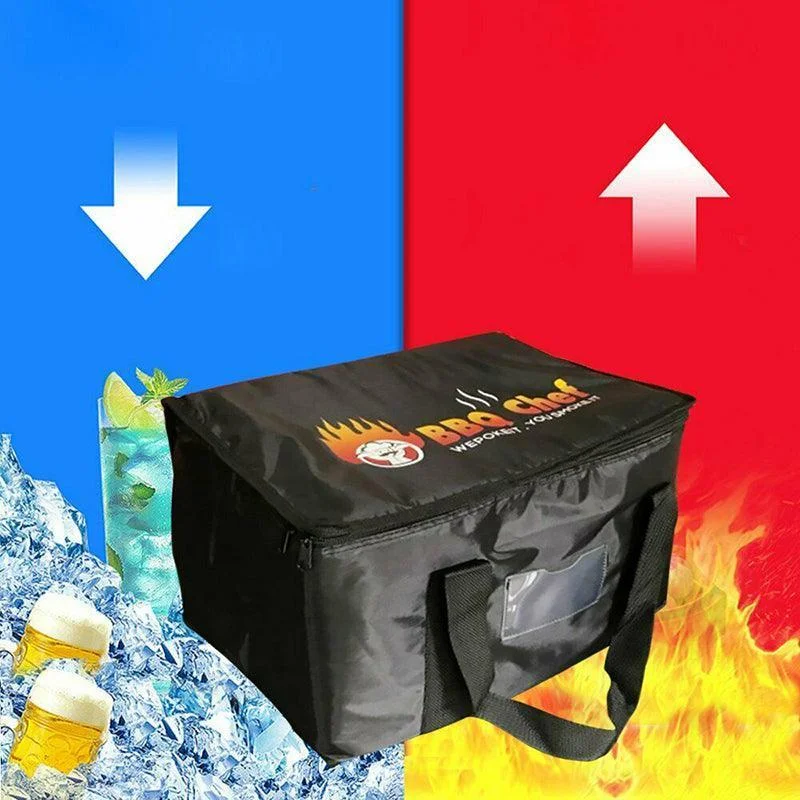 This insulated food delivery bag is designed to keep food warm or cold for longer, making it ideal for takeaway, pizza delivery, catering, or grocery transport. Made from waterproof Oxford cloth with an aluminium foil and pearl cotton lining, it ensures excellent insulation and durability. Available in three sizes (16L, 28L, and 50L), this thermal bag provides ample storage capacity for different delivery needs. The double zip design and front pocket make it convenient for professional or home use.