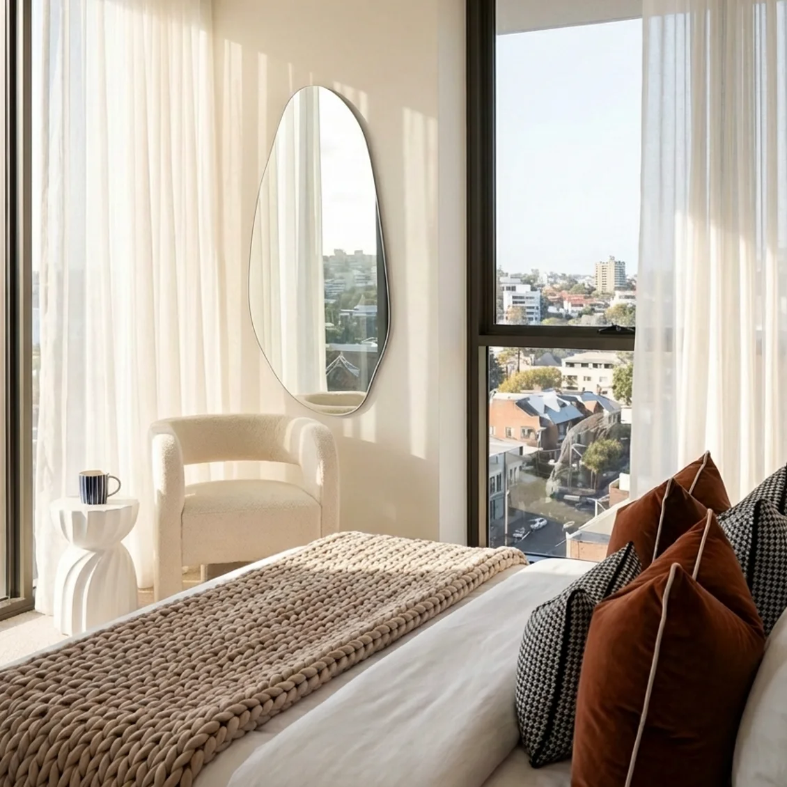TheJewel Mirror embraces soft asymmetry, organic contouring and a beautifully imperfect silhouette that elevates any interior. Its frameless bevel edge adds a refined, jewellery-like detail, catching light softly throughout the day.