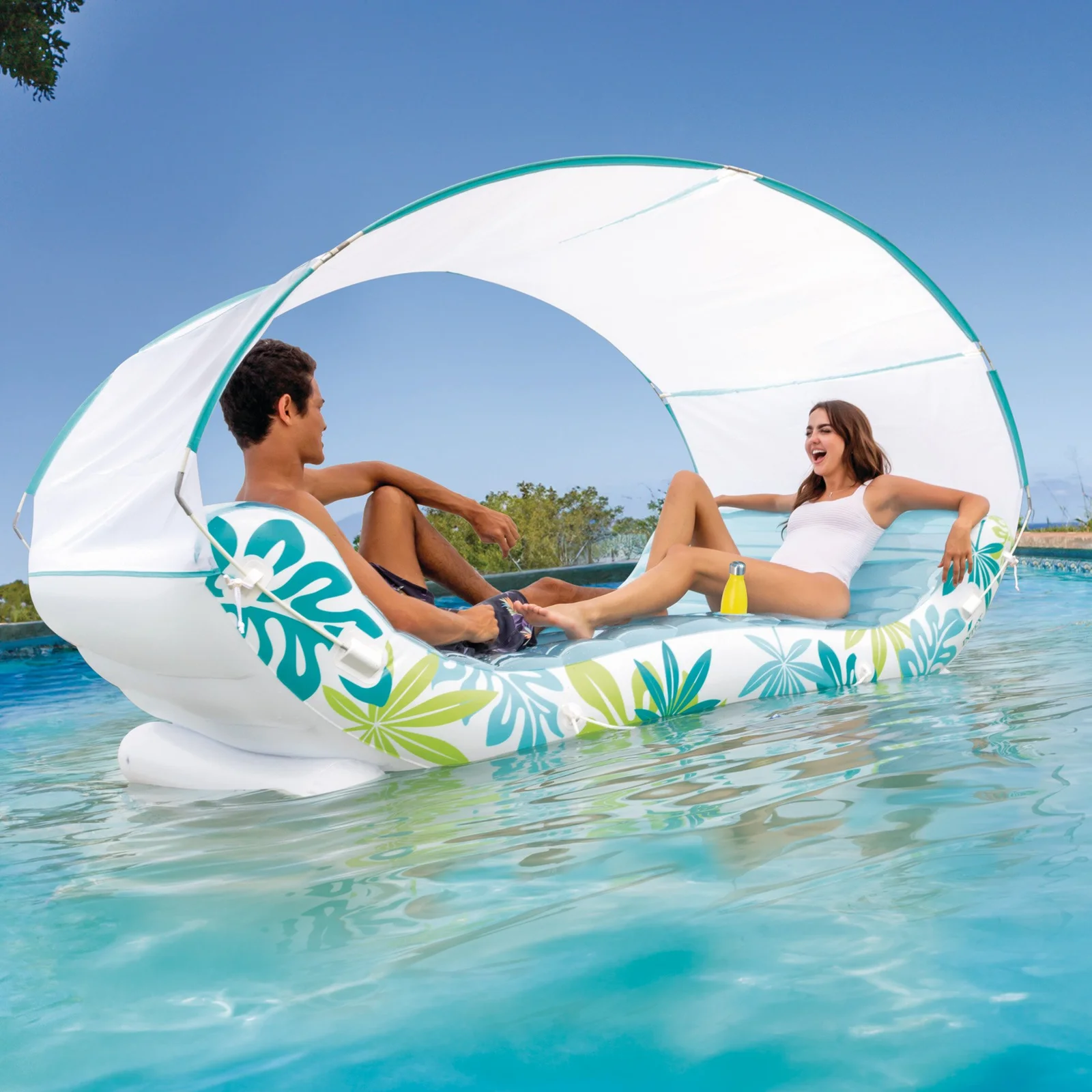 Sail into paradise with the Intex Tropical-Themed Canopy Lounge! Bask in the sun or seek shade under its detachable fabric sunshade, while sipping on your favourite beverage from the convenient cup holders. With two grab ropes for easy maneuvering and a repair patch for peace of mind, this lounge ensures endless relaxation in tropical style.