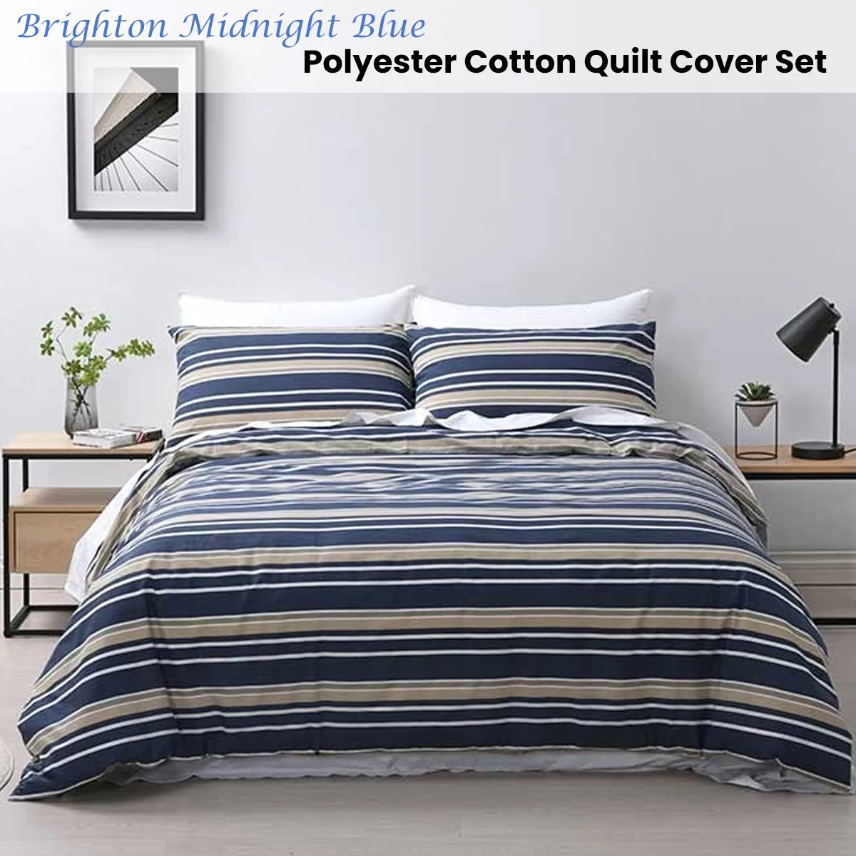 Indulge in luxury and comfort with Brighton Midnight Blue Quilt Cover Set by Jason. Printed 50%/50% Easy-Care Polyester/Cotton. Tonal diamond pattern. Press stud opening. Tailored Edge 1cm. Twin Needle Stitching. Designed to transform your sleeping experience into a peaceful retreat, this set combines contemporary style and comfort. Features stripes design printed in midnight blue, white, and taupe - echoing the tranquil beauty of a moonlit night sky.