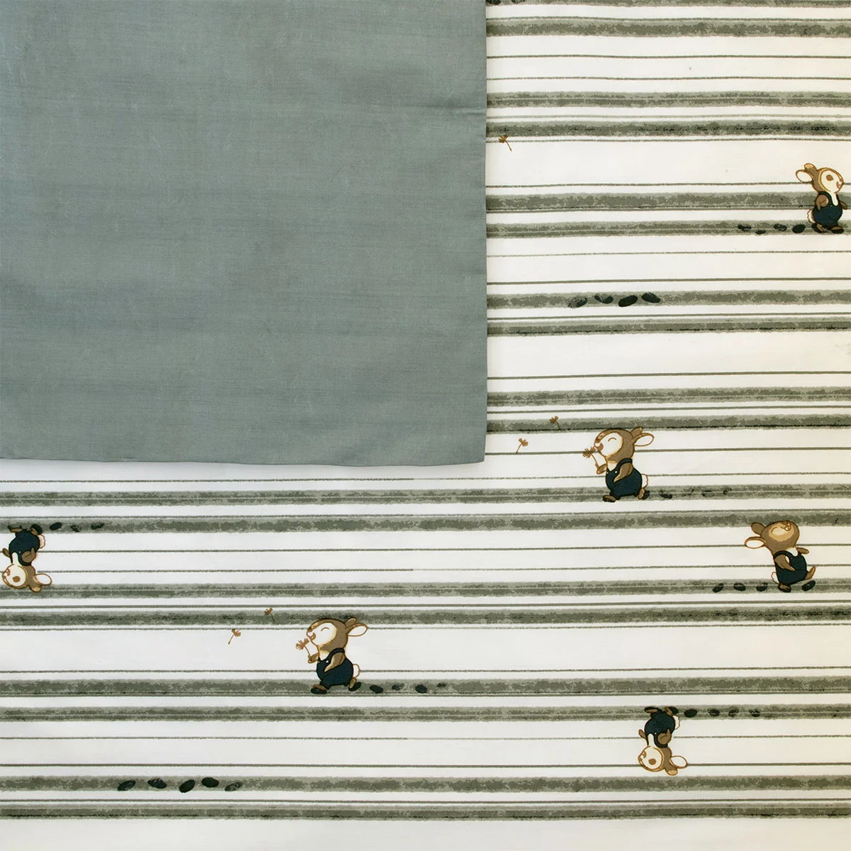 Logan Denim Quilt Cover Set by Jelly Bean Kids contrasts classic horizontal stripes with a plain dyed reverse and texture peppered throughout printed in cream, grey, charcoal, navy, and brown colour tones; playful and uncluttered patterns create a happy combination. Features story book bunny rabbits on a fun adventure! It is made from soft touch and quality Polyester Cotton blend fabric.