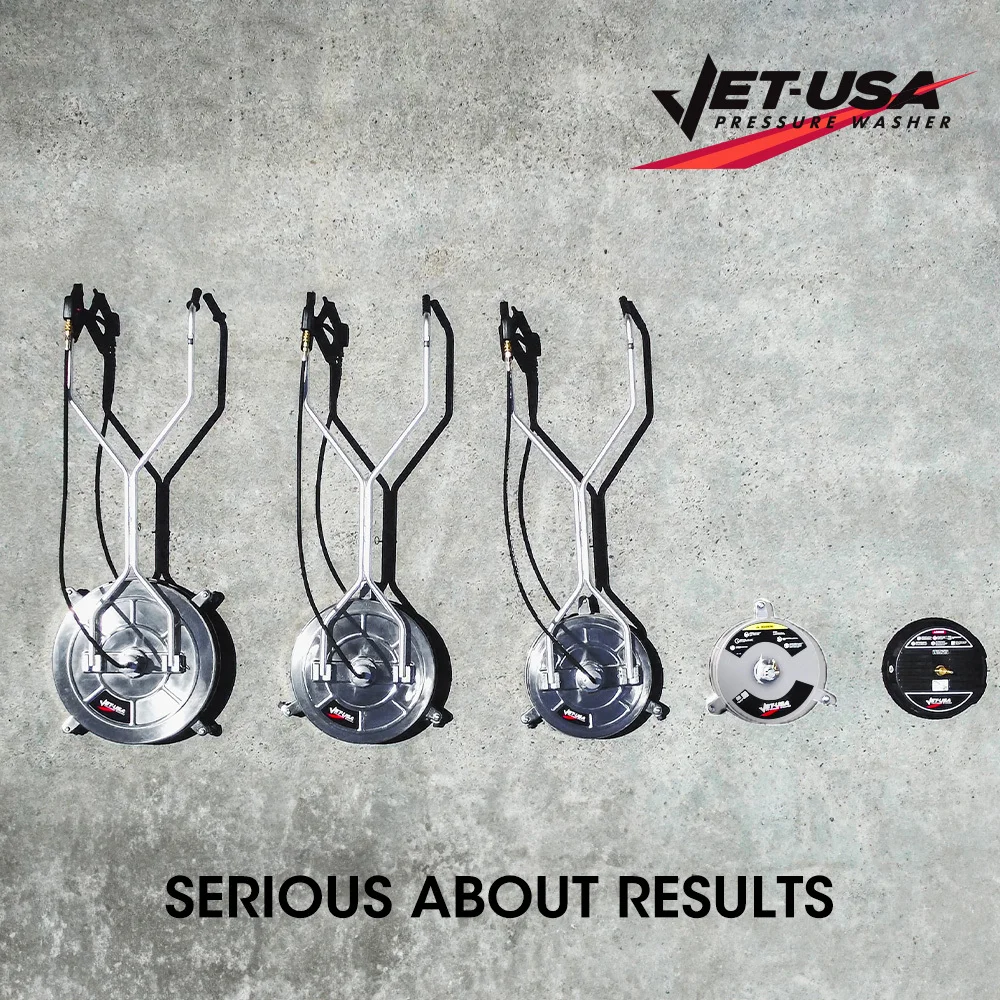 The Jet-USA has a stainless steel body with two nozzles spinning at 2500 RPM mounted on 3 corrosion-resistant castors for consistent coverage. Powered by up to 4000 PSI this heavy-duty cleaning disc delivers the outstanding results you've come to expect from Jet-USA.
