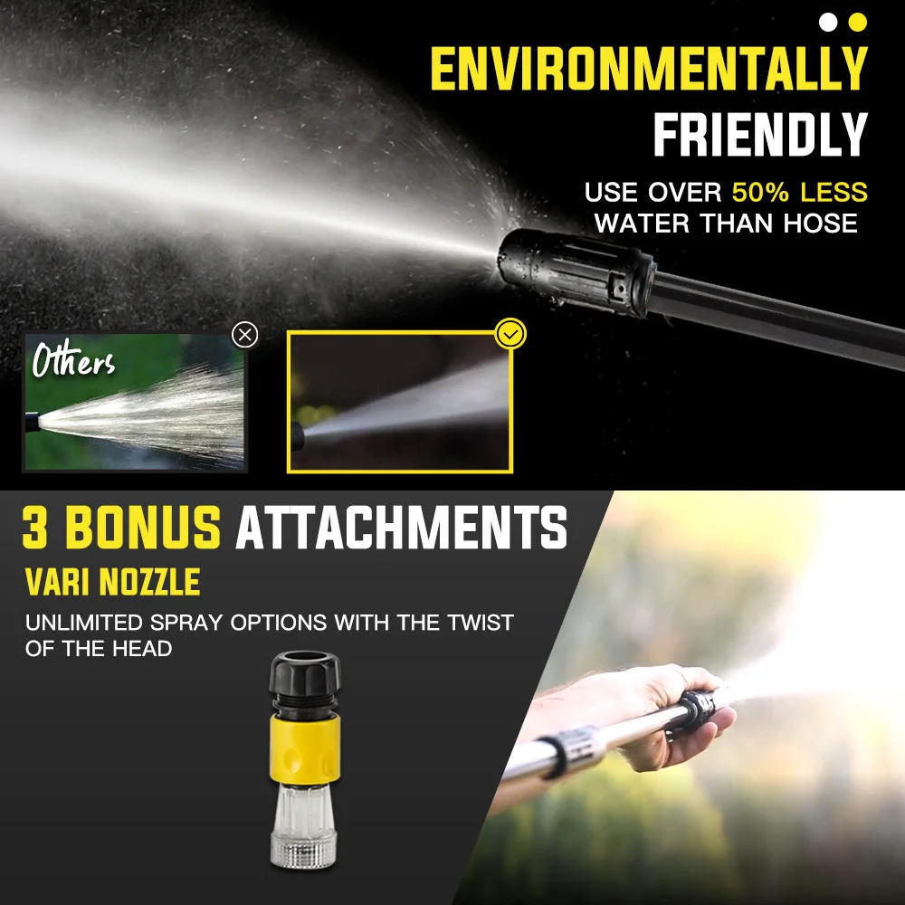 Youll receive a class leading three bonus attachments, a Vari-Nozzle, Inlet Filter as well as a Detergent Bottle, so you can spray suds and then rinse immediately after with the twist of a knob! With this arsenal of attachments you will be able to specifically tackle the most stubborn of grime! Who said cleaning was a chore?