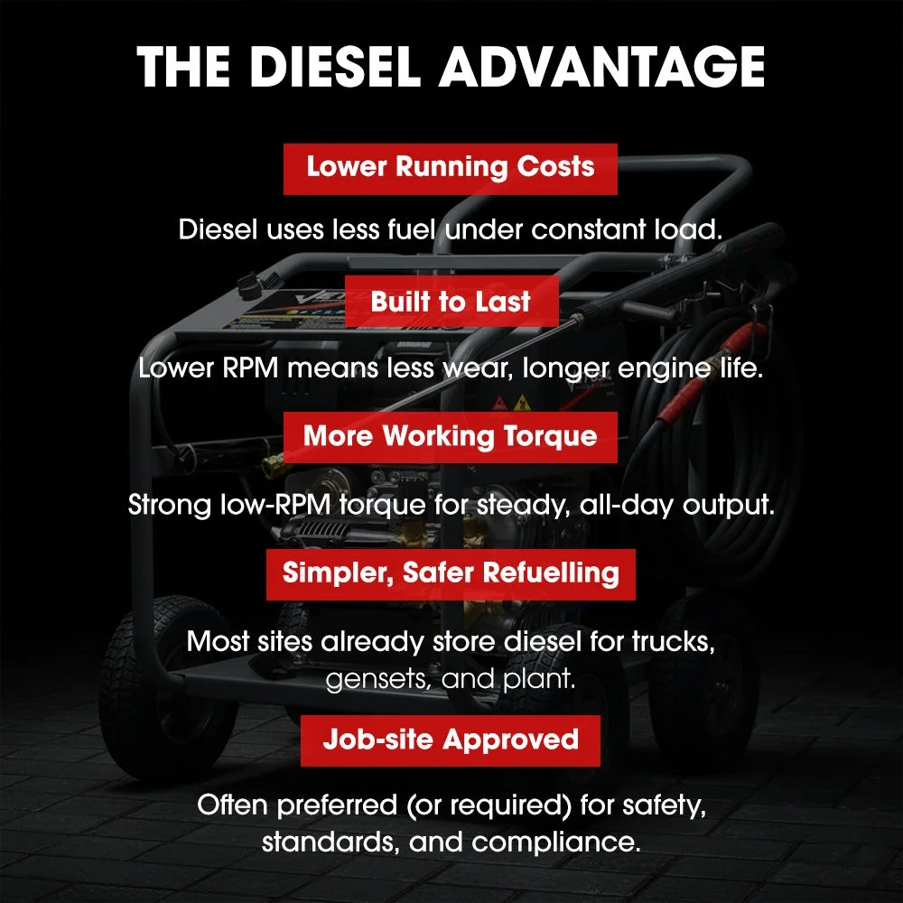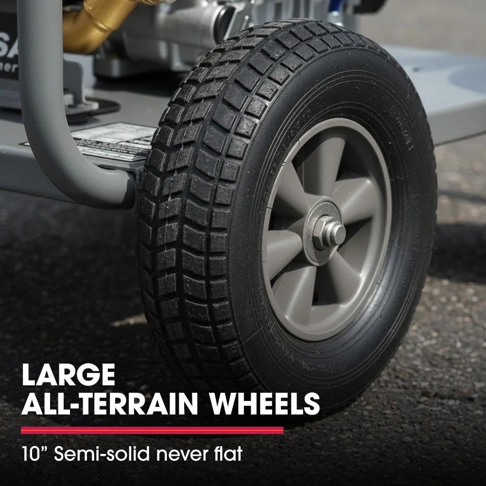 Built on a tough steel frame with 32mm round tubing. Beneath the pump, a dedicated anti-vibration support frame minimises movement under load, helping preserve long-term performance during heavy commercial use. 10-inch all-terrain no-flat tyres glide easily over rough ground. It's all about speed, strength, and no-fuss reliability.