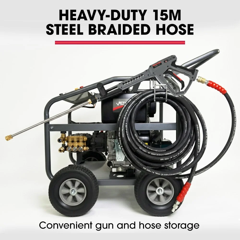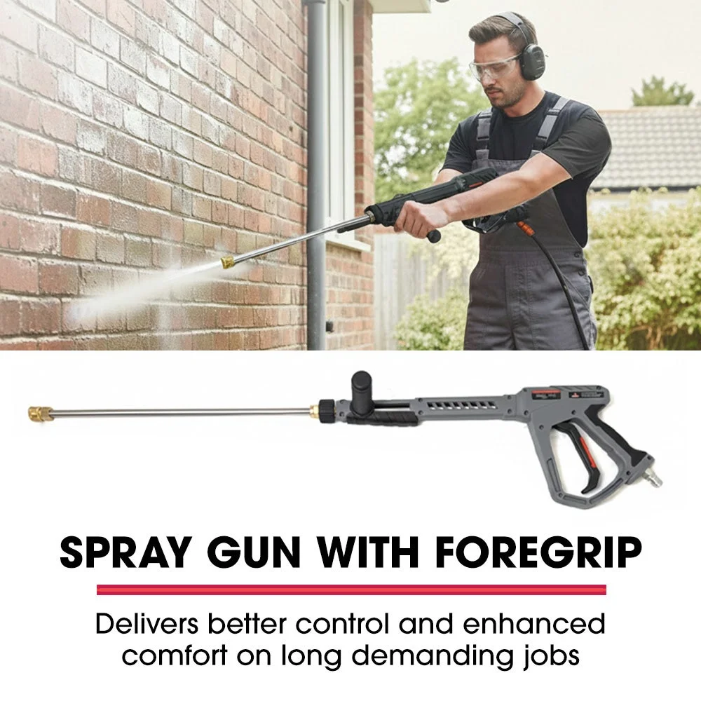 Precision matters, and the DX800 delivers. A pro-grade spray gun pairs with 5 quick-connect nozzle tips and a 15m steel-braided hose to give you maximum reach. The addition of a horizontal foregrip ensures that you have maximum control with less fatigue. Whether you're cutting through concrete grime, stripping paint, or foaming up with detergent, you've got the gear to do it right.