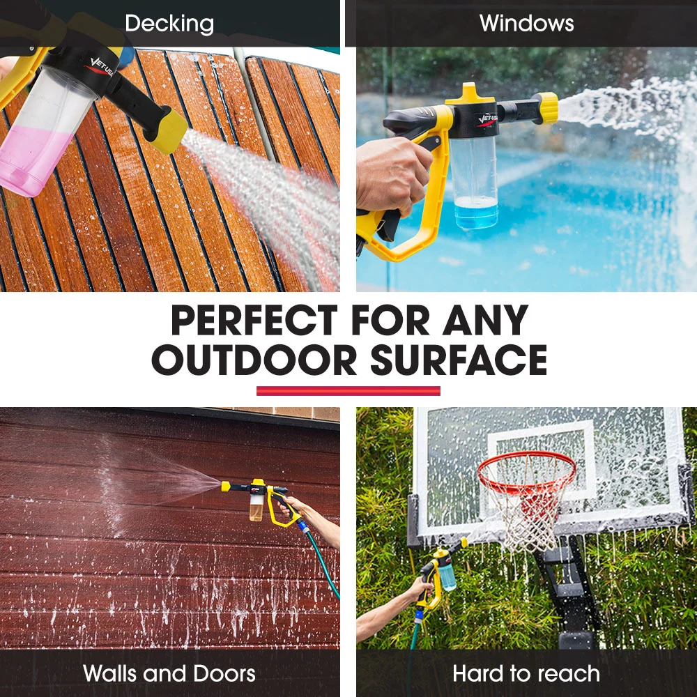 Our foam gun is not limited to just cars; it can be used for cleaning motorcycles, floors, windows, driveways, roofs,walls and more. Ideal for enthusiasts and professionals alike. Designed for your convenience, its versatility makes it a must-have cleaning tool.