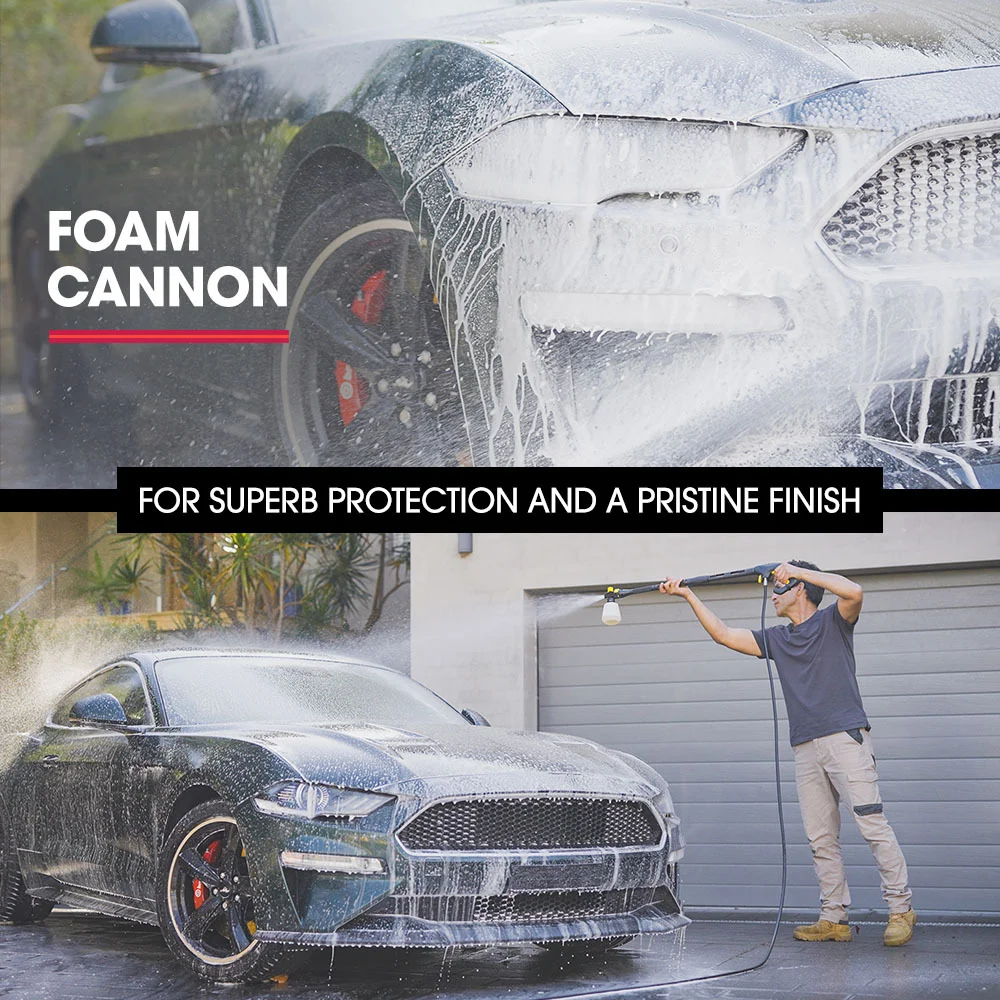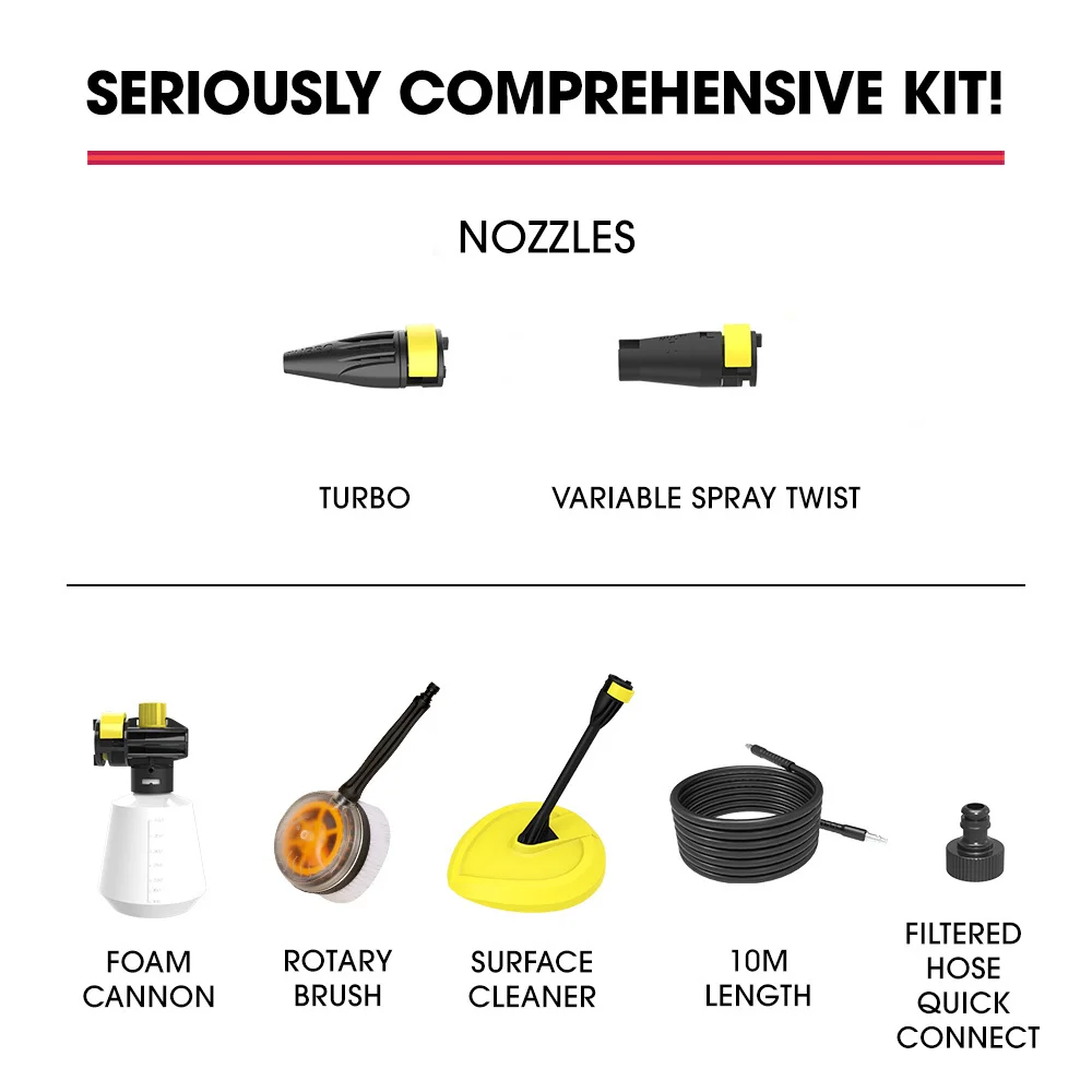 Attaching the detergent bottle and the detergent nozzle allows you to easily apply suds when cleaning cars while the rotary brush head attachment provides extra scrubbing power. The surface cleaner head is ideal for decks, paths and driveways. With a Vari-Nozzle, a Detergent Nozzle and a Turbo head, this High Pressure Washer offers versatile cleaning options to suit any task!