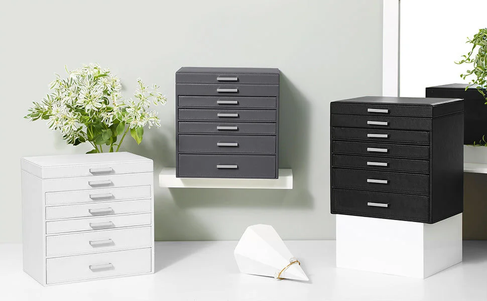 - Keep your jewellery organised and easily accessible with this stylish jewellery box. Featuring multiple drawers of varying heights, it's the perfect way to store and display your bracelets, earrings, necklaces, rings, watches and sunglasses.