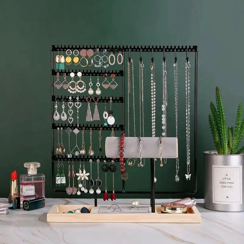 Multi-Layer Storage: Equipped with 12 hooks for necklaces, 108 earring holes, grooves for rings, and a spacious wooden tray for bracelets, watches, or other accessories.