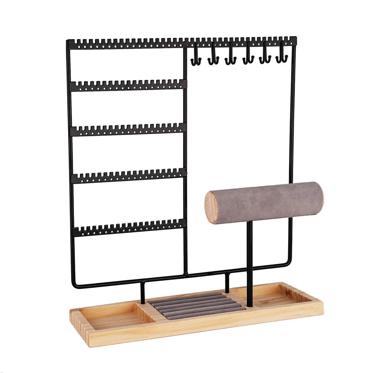 Capacity: 12 necklace hooks, 108 earring holes, and ring grooves