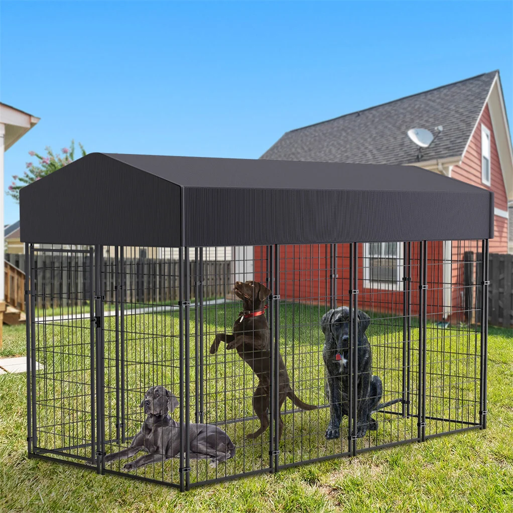 Waterproof cover included The heavy-duty waterproof cover and steel roof frame fit the outdoor dog pen perfectly and the enclosed ends provide your pet with full protection from sun, rain, snow and debris. Added UV protection prevents ripping, cracking, fading or peeling giving you years of worry-free use. Sturdy elastic cords won't break or stretch and hold the cover securely for a snug fit. The roof pitch allows for water, debris and light snow to run off instead of accumulating on the roof
