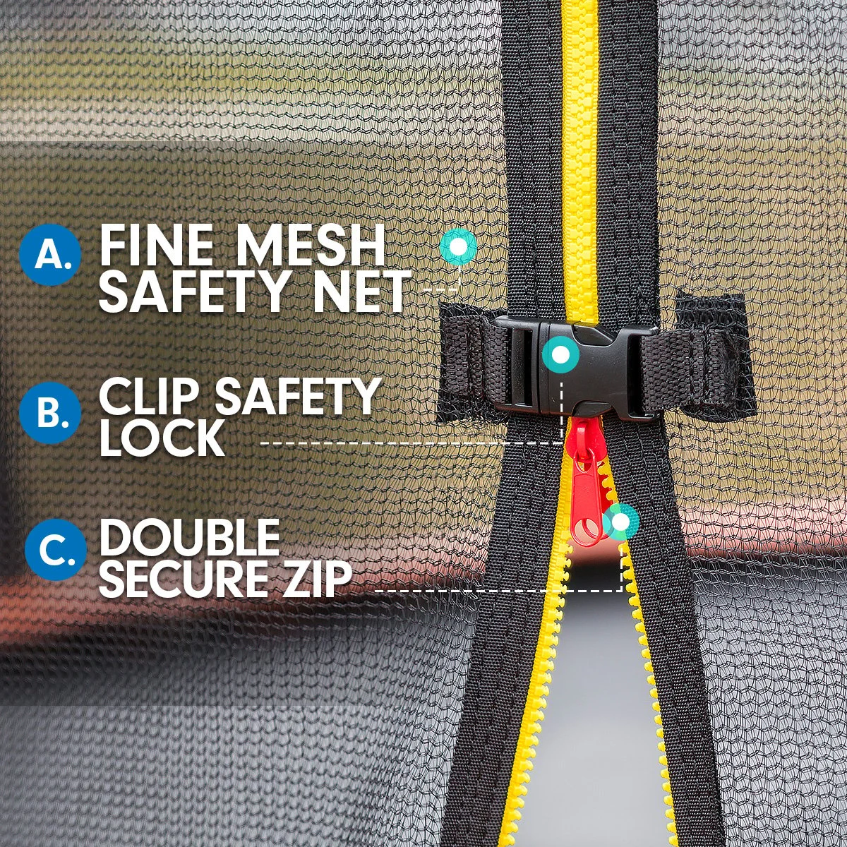 - Trampoline Entrance: Zip-and-clip safety lock