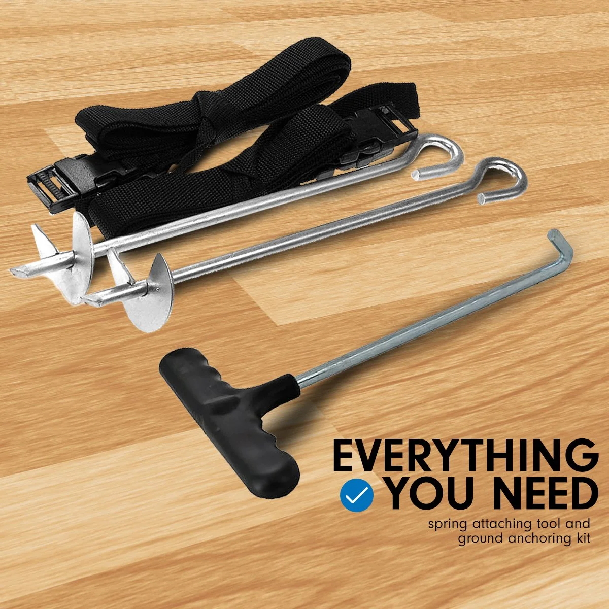 This is a heavy trampoline and uses linked legs and grounding straps for superior stability. The structure of the legs also minimises the tendency for legs to dig into the ground.