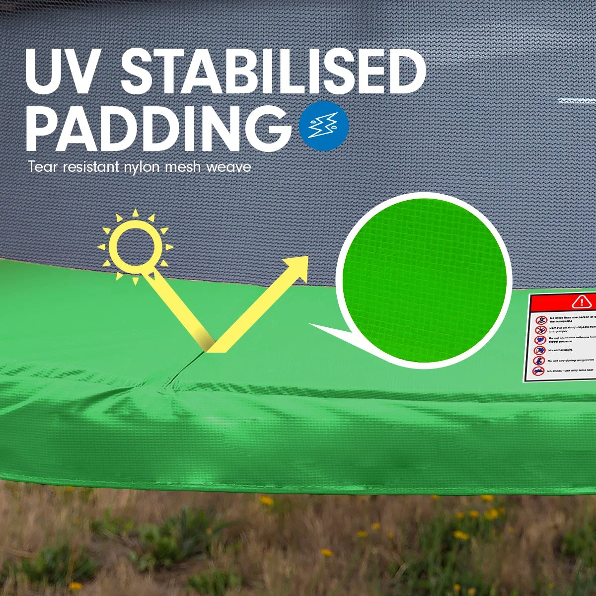 The padding cover of the trampoline is UV stabilised and has embedded nylon mesh, ensuring the padding will last under the harsh Australian sun.