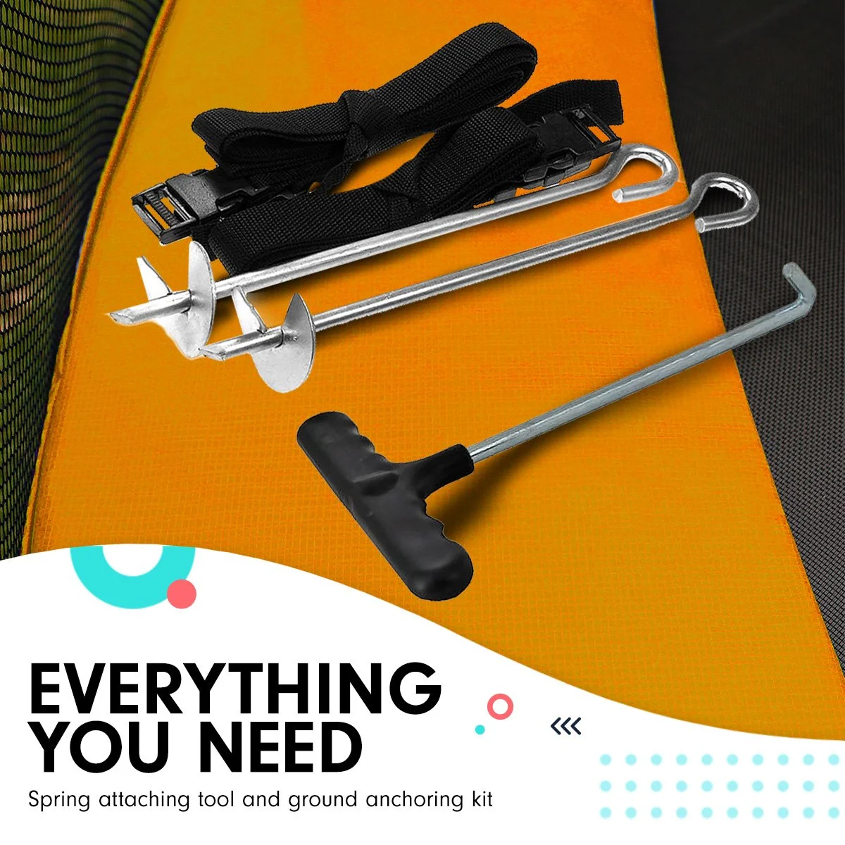 This is a heavy trampoline and uses linked legs and grounding straps for superior stability. The structure of the legs also minimises the tendency for legs to dig into the ground.