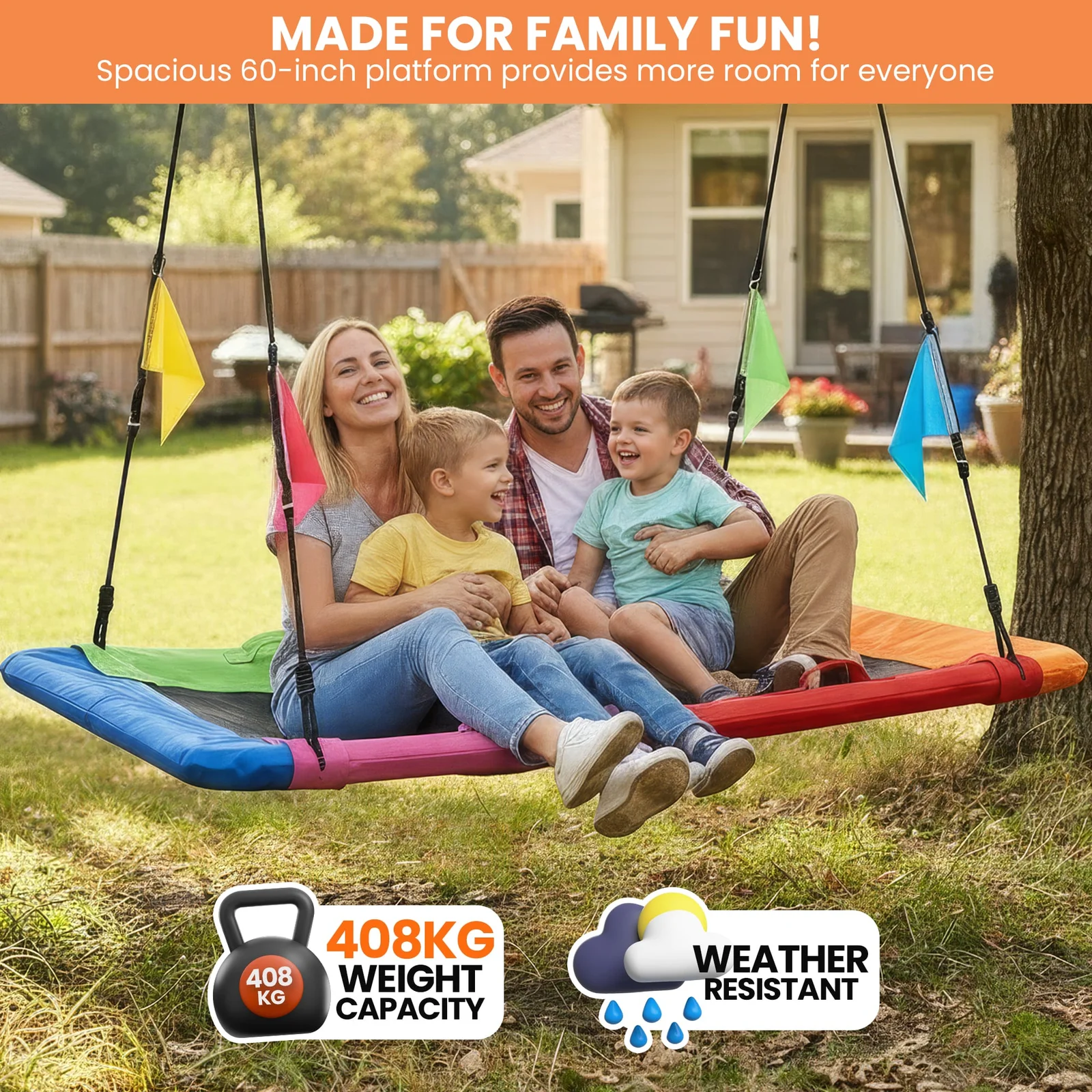 The spacious 32 x 60 inch platform provides more room than traditional round swings, making it comfortable for sitting or lying down. Foam padded tubes add extra comfort during play, while the complete accessory kit ensures easy installation. Suitable for children and adults under proper supervision, its designed for shared outdoor enjoyment.
