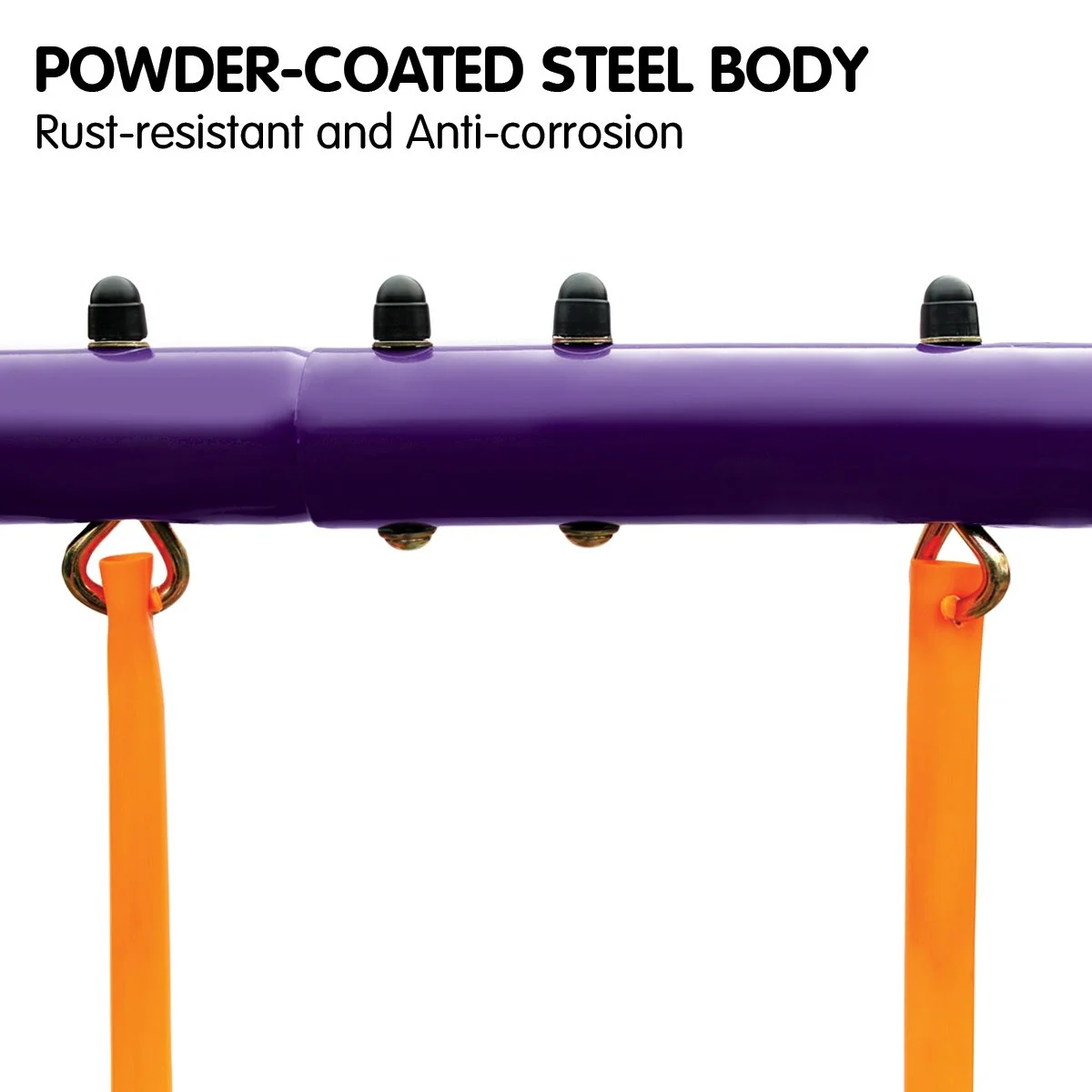 With two solo swings and a tandem glider, the Kahuna Kids Swing Set is a thrilling addition to any backyard. It has a mega sturdy frame with 4 swing seats, giving your family four times the fun!