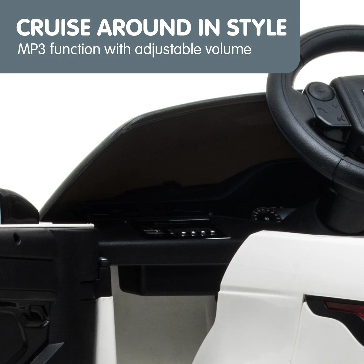 This ride on is designed to impress with its two swing-out doors and unique set of wheels. It has a child-friendly digital dashboard, with a horn, music player and an ignition key start. Young drivers will love the accelerator, steering wheel and forward/reverse switch, which allow them to drive just like Mum or Dad. Perfect for make-believe play or exploring the yard!