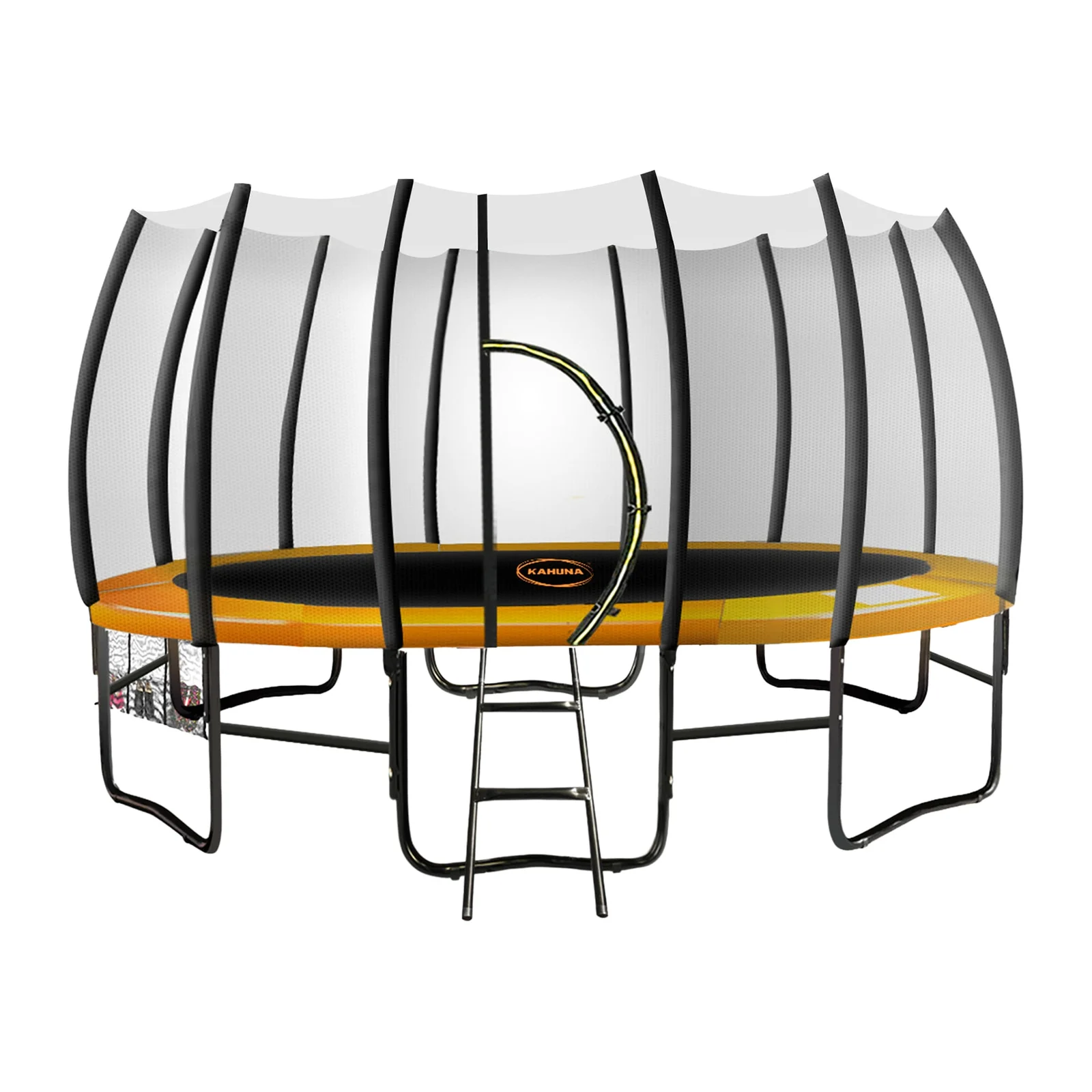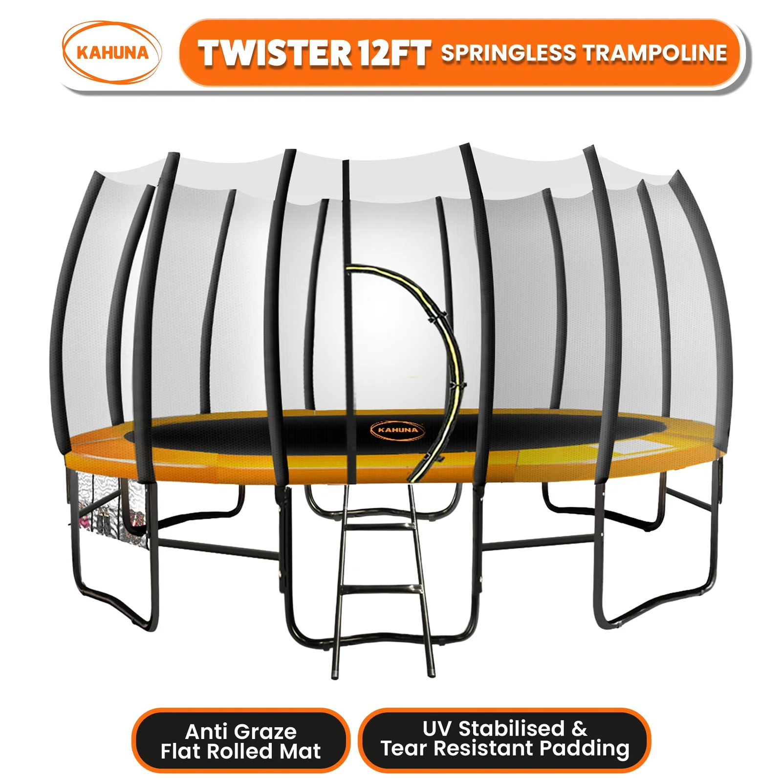 This springless trampoline also comes equipped with U-shaped legs and a ground anchoring kit to ensure stability and reduce the risk of the trampoline toppling over or sinking. Additionally, the Kahuna Twister Springless Trampoline has a hanging mesh compartment, a ladder and two pairs of anti-slip jumping socks for added safety.